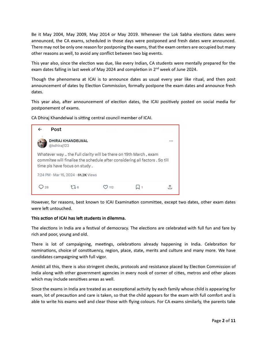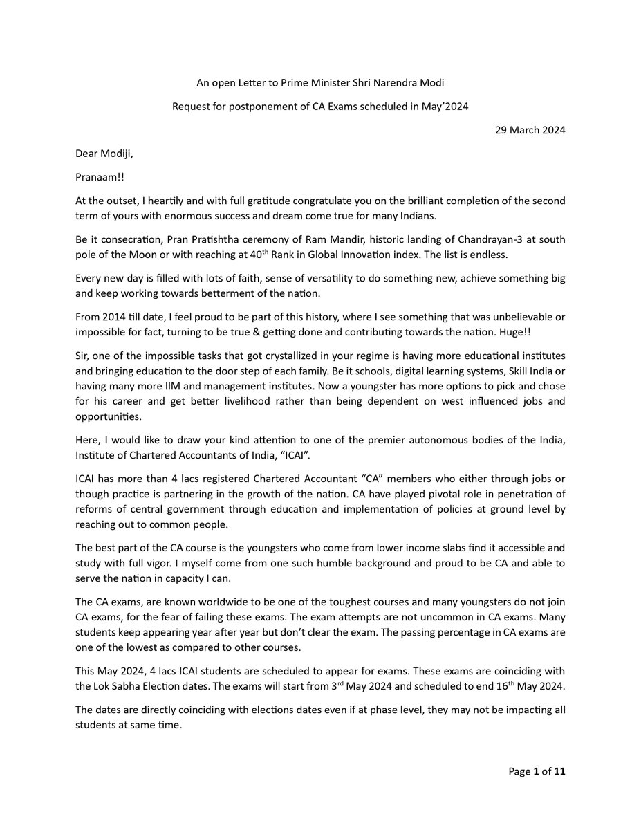 Dear @narendramodi Sir, writing a letter to you with final hope that exams at @theicai will be postponed to June 2024. CA Students running pillar to post for this, but no support or help. All requests falling on deaf ears.