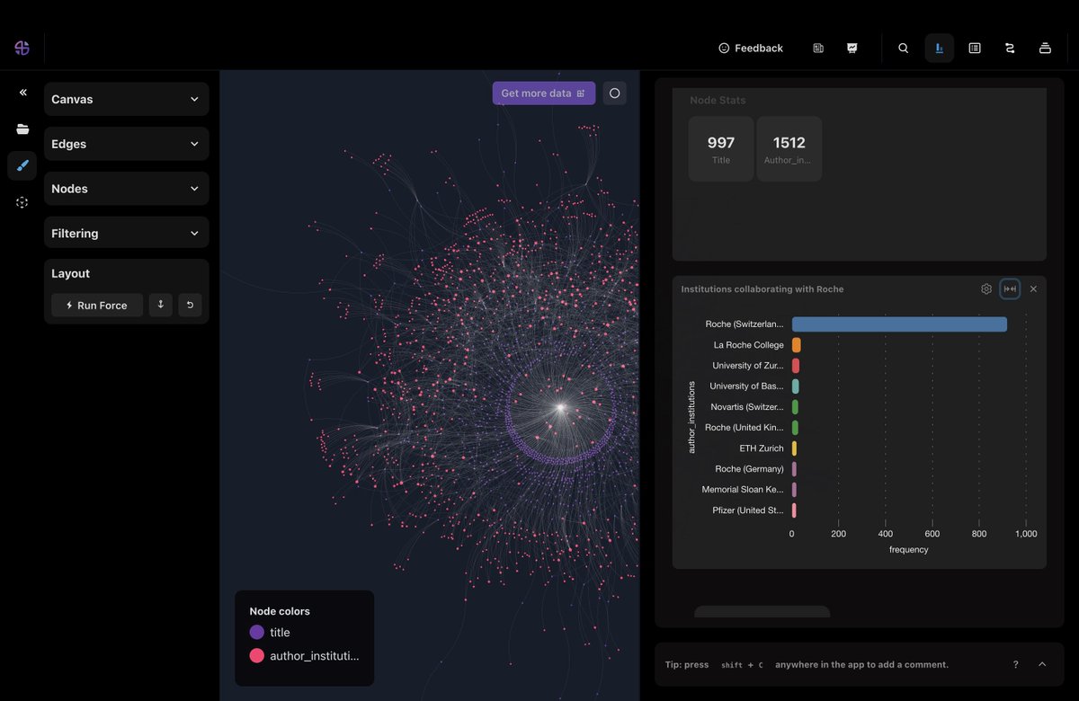 To demonstrate how someone might use #networkAnalysis I decide to explore the co-authorship network of Roche🇨🇭 I initially retrieved 200 papers from Roche 🇨🇭 by using the CSX advanced search and from there expanded the #network to 1k papers from Roche 🇨🇭 authors (see picture)