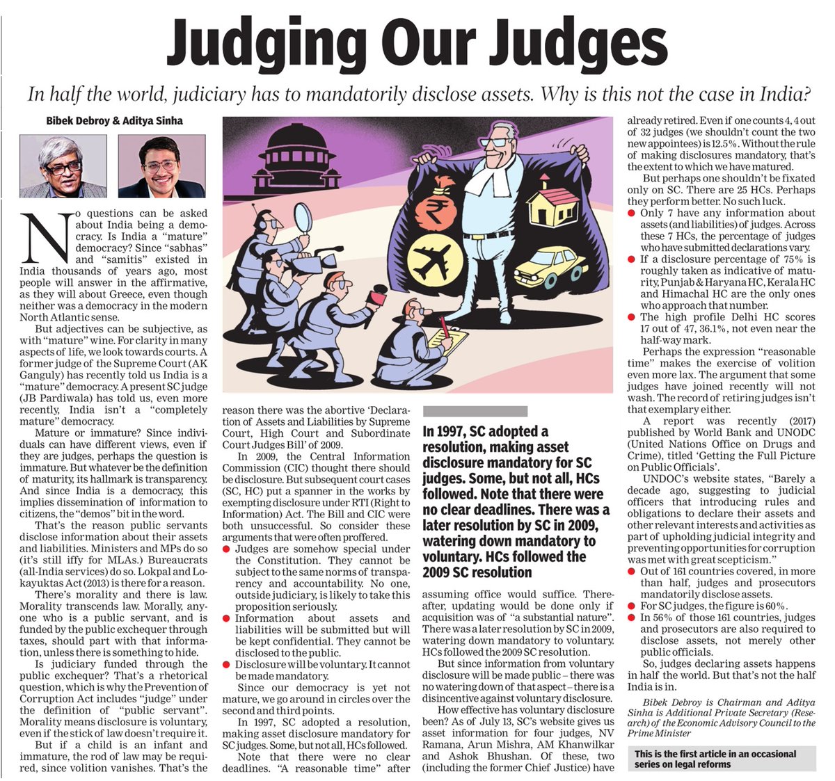 Our series of columns on Legal Reforms in @TOIIndiaNews. The first one in the series is on the declaration of assets by the judges. In half the world, the judiciary has to mandatorily disclose assets. Why is this not the case in India? (1/n) @bibekdebroytimesofindia.indiatimes.com/india/judging-…