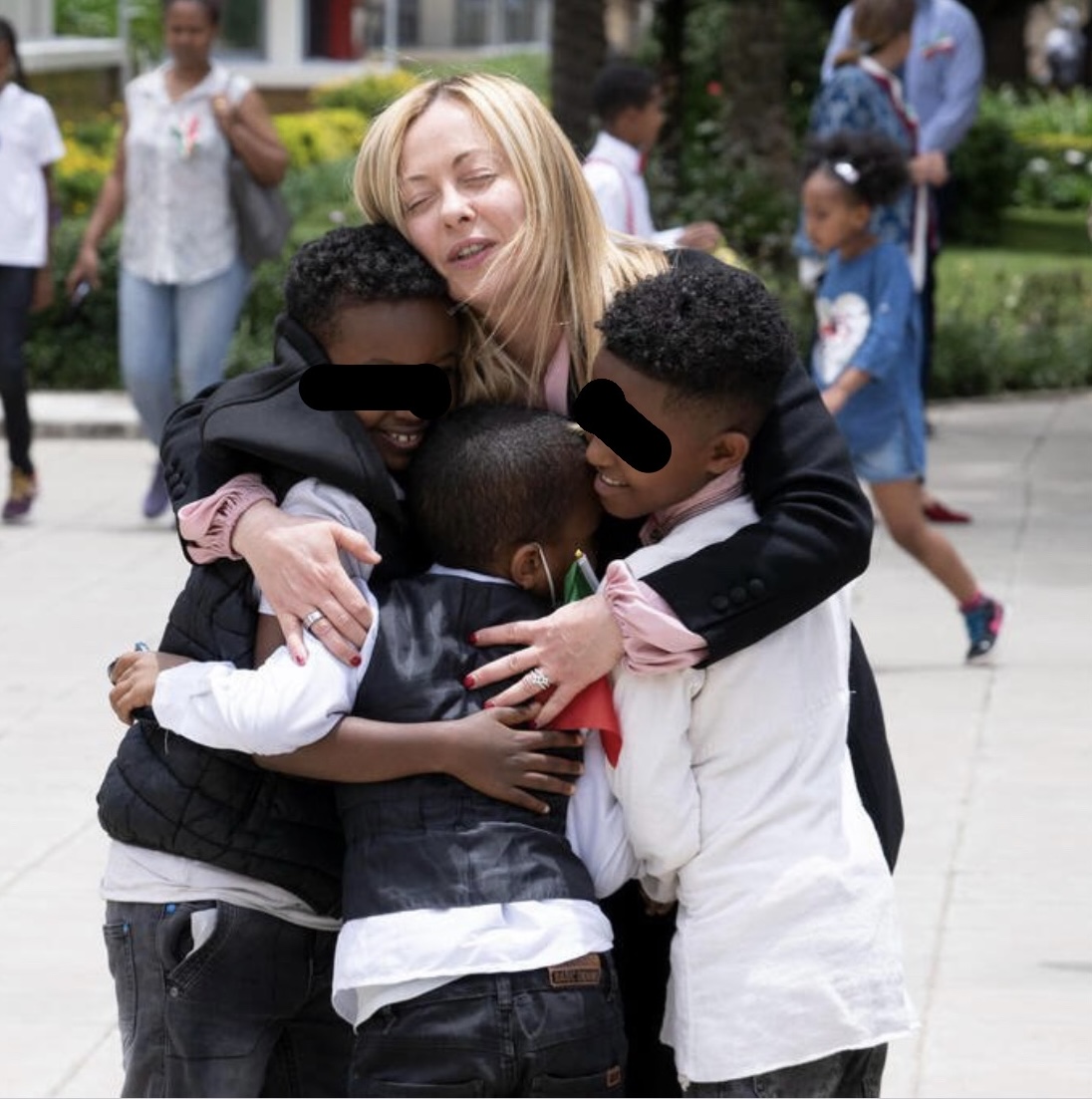 1) Que els hereus del Partit Feixista governin Itàlia ofereix moments històrics en el pitjor sentit, com aquesta foto propagandística de Meloni abraçant criatures etíops. No és no+ l'enèsima foto ignominiosa de 'blanca instrumentalitza nens negres somrients'. Darrere hi ha molt+: 2) Etiòpia ha estat sempre un lloc molt important per al feixisme. Fou una de les obsessions de Mussolini (el "lloc al Sol" que va prometre als italians) i no va parar fins a sotmetre-la com a colònia. I hi va dur a la pràctica un dels pilars ideològics del feixisme: el racisme.