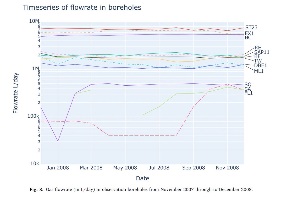 The data from a recent 2022 published paper shows a median flow rate of 2 million or c. 70 600 cf/d from 13 boreholes measured over a period of 14 consecutive months.