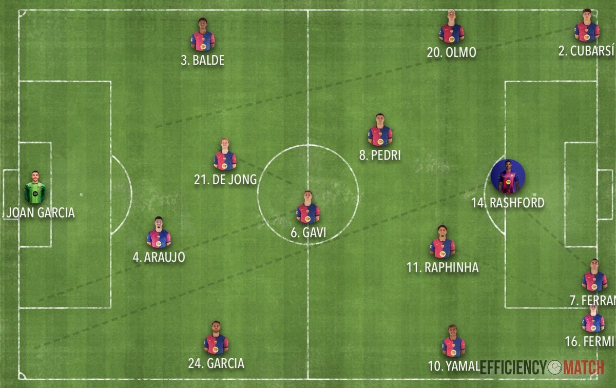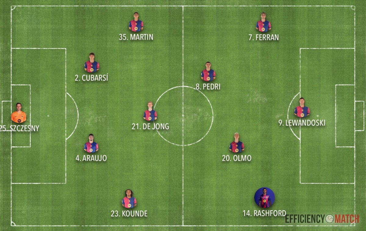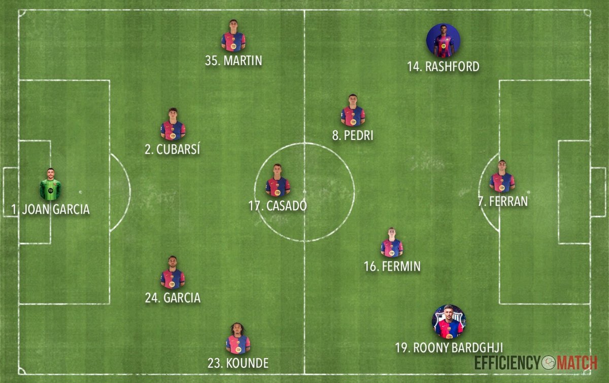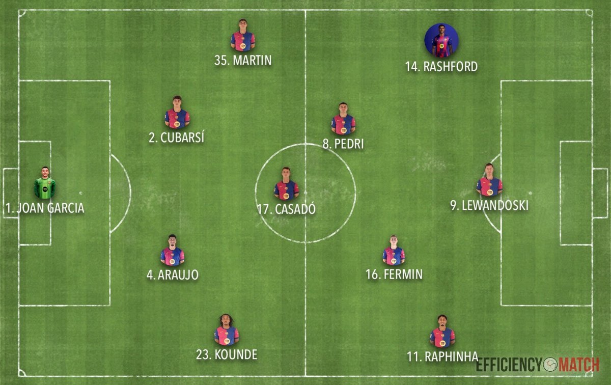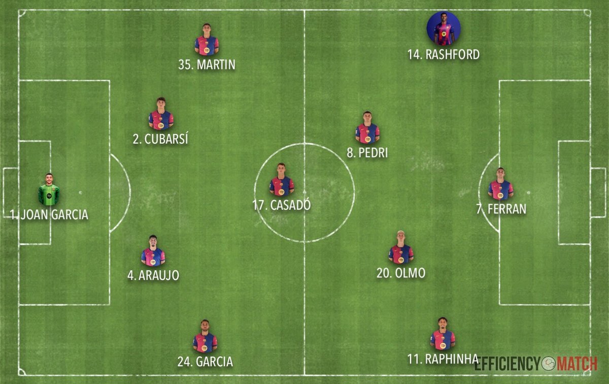 CASADÓ Y RASHFORD A ESCENA: Después de una semana convulsa, Flick dio un mensaje contundente en el one alineando a Marc Casadó como seis. Eso trasladó a Raphinha a la media punta.