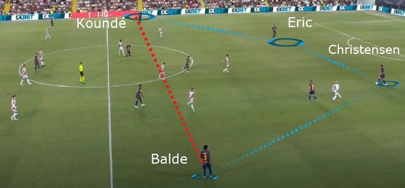 This began with with three centre-backs with Eric alongside Araujo, with Raphinha and Gerard Martín providing width, Ferran up front and Dani Olmo sitting in behind.