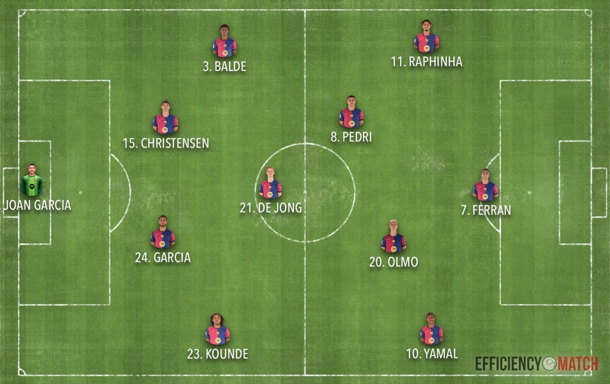 GERARD, CASADÓ Y ROONY: Ante las bajas importantes con las que contaba el equipo, Flick quiso demostrar confianźa máxima en la plantilla optando por la primeras alternativas en las posiciones afectdas: Gerard por Balde, Casadó por De Jong y Bardghji por Lamine