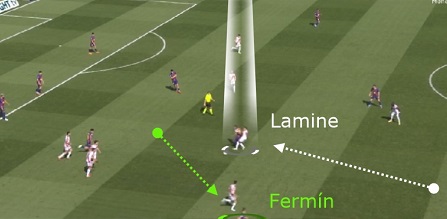 ERIC Y DE JONG LEJOS : Flick decidió suplir la baja de Pedri con Eric, De Jong y Fermín. Pero esta vez el Barça no jugó con doble base sino con doble media punta. El canterano jugó por delante de la defensa como único medio y el neerlandés alineado con Fermín.