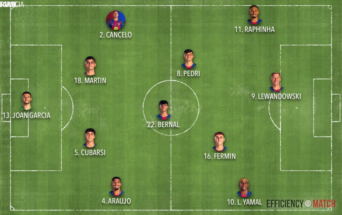 BERNAL AL LADO DE FDJ: Flick sacó un 11 con novedades pero todas con explicación futbolística. En defensa, dio entrada a Cancelo para tener un lateral muy ofensivo. Arriba, Lewa y Olmo ya que el encuentro pedía un rematador y un MP con capacidad en espacios reducidos