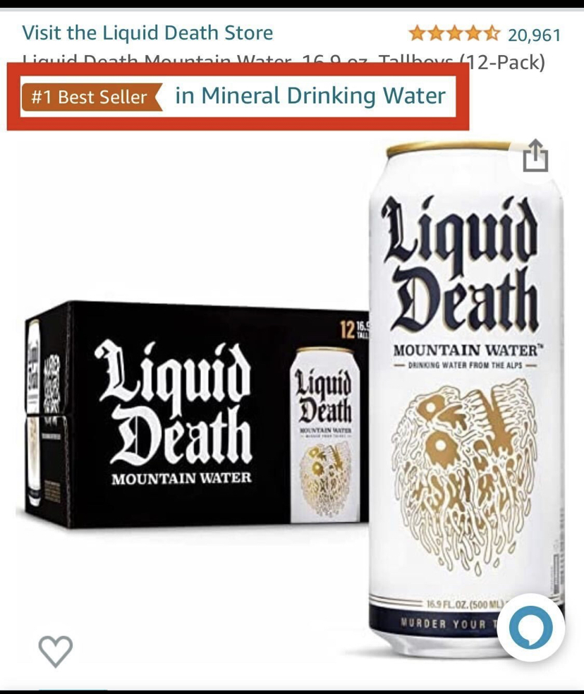 How does Liquid Death Achieve the best seller badge in the Mineral Drinking Water category?