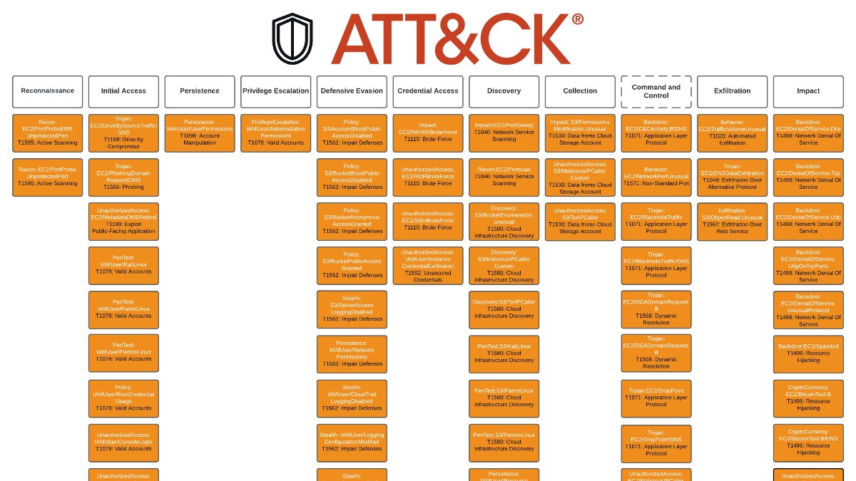 Mapped all of the Amazon GuardDuty Findings to @MITREattack. A bit more of an art than a science. Hopefully useful to some detection and response teams out there. See 🧵for more detail 👇 github.com/amrandazz/atta… There were a few discrepancies with existing Finding mappings and how I mapped them. I tried to document why I did what I did. Created image in @lucidchart and clearly not an artist (vdx available for those that are). Full res in GitHub with navigator json