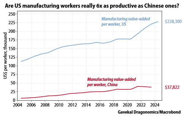 This means that on a per-worker basis, US manufacturing still looks insanely productive: each worker produces over $200,000 in value-added, while in China each manufacturing worker produces less than $40,000 in value-added. So the US still has a productivity edge. 2/