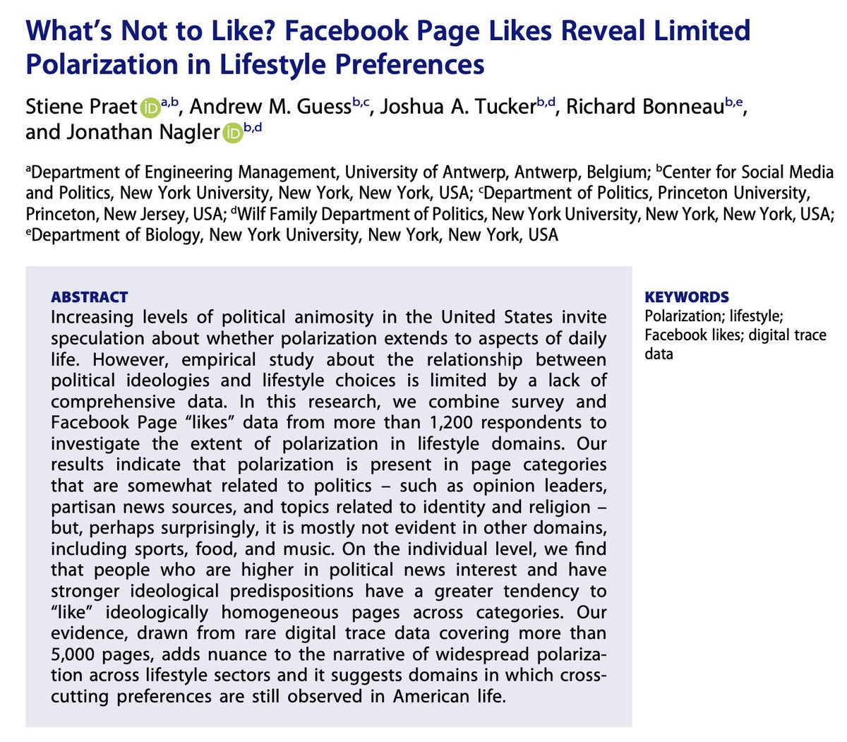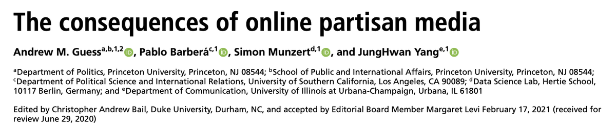 TL;DR: Surveying people after a real-world intervention that boosted the amount of partisan news they encounter, we rule out modest effects on issue importance, political opinions, turnout/vote choice, approval & affective polarization -- i.e., the usual outcomes we talk about /2