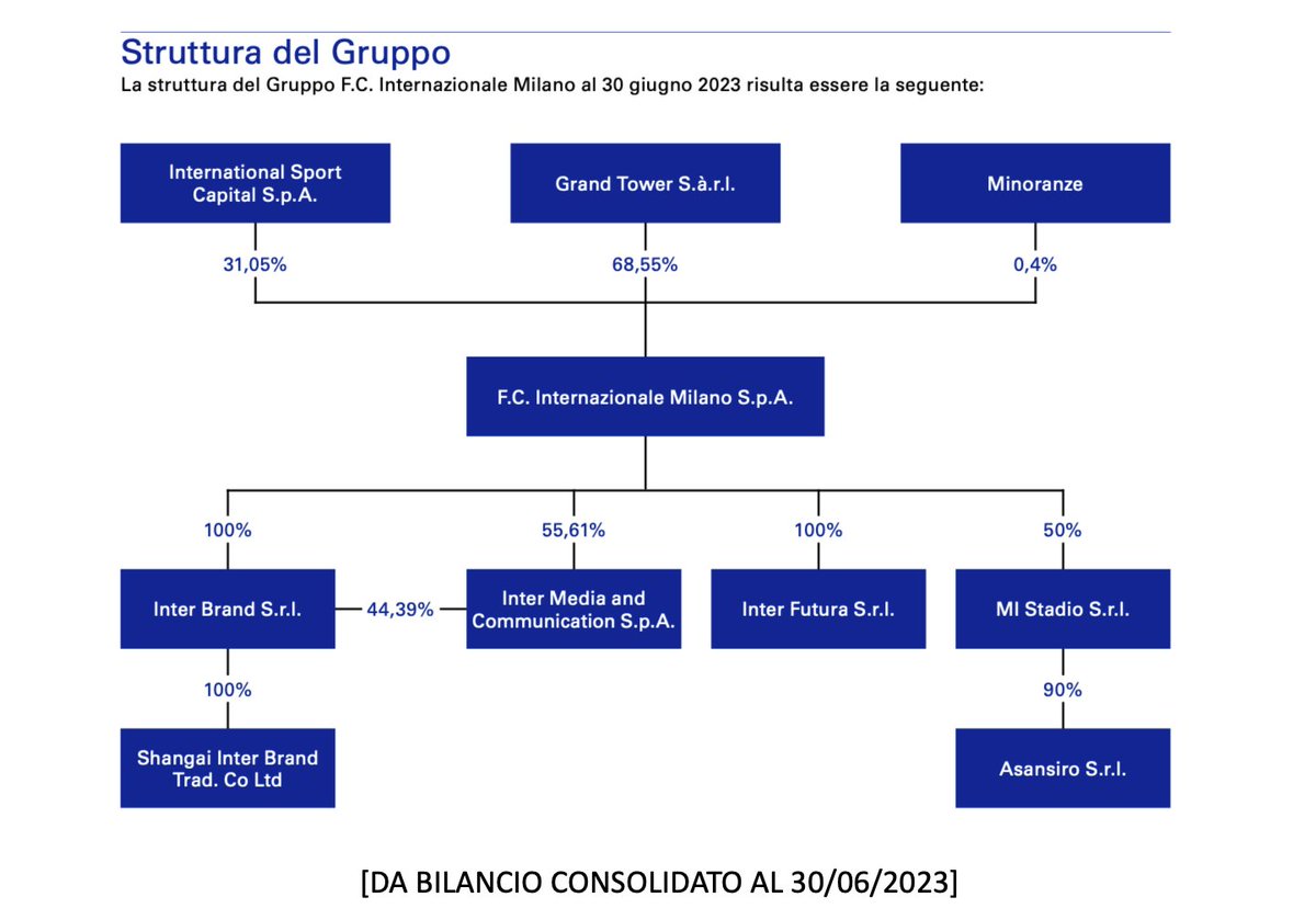 1⃣ L'F.C. Internazionale Milano è una Società per Azioni i cui dati economico/finanziari ed informazioni societarie sono disponibili e di dominio pubblico. In questa immagine la struttura del gruppo come da ultimo bilancio. ⬇️