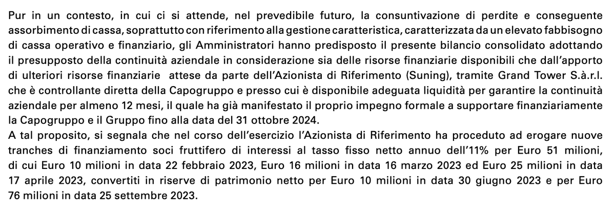 In questo paragrafo si fa riferimento a Grand Tower S.à.r.l. Si tratta di un semplice veicolo finanziario lussemburghese che fa parte della catena di controllo societaria. Di questo ne parleremo in seguito. Lo screenshot è un estratto dal paragrafo “Continuità aziendale”.