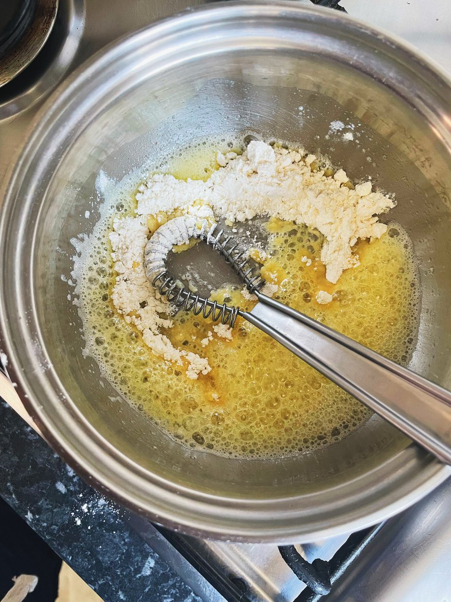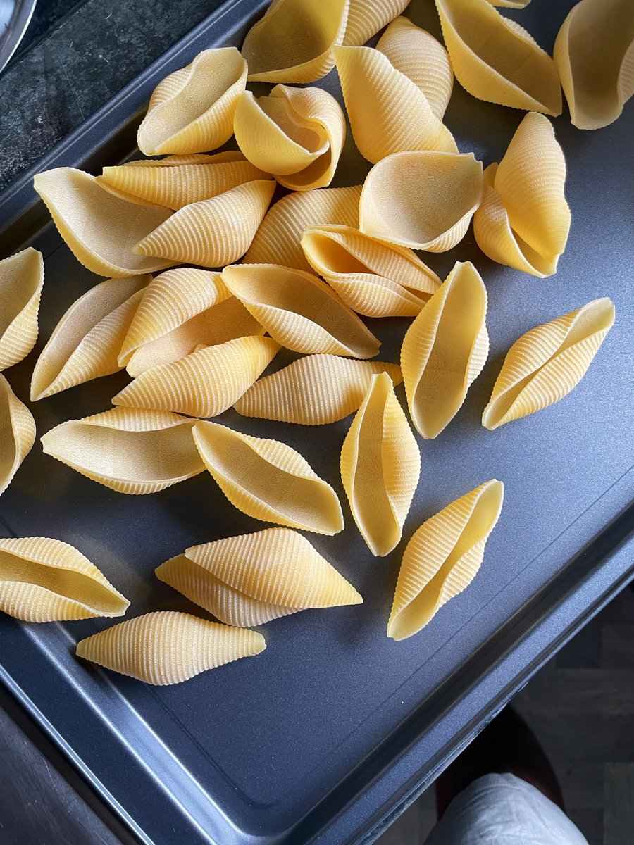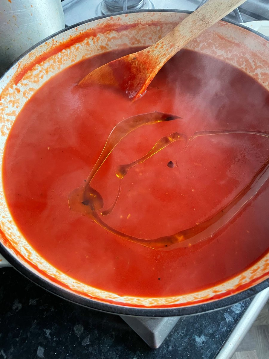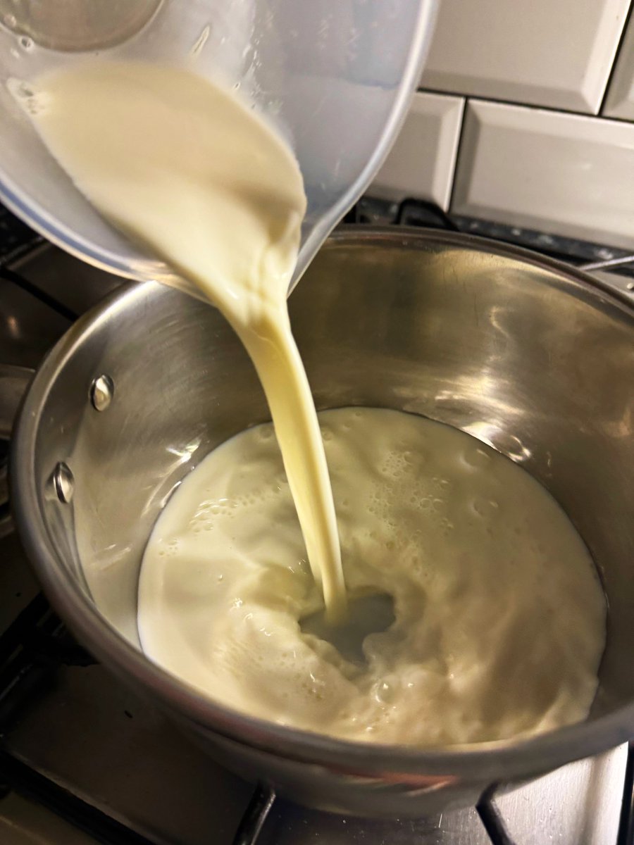 I’ll get the tomato sauce on first. A whole bottle of strained tomatoes (or passata). Get a nice one, with garlic in or something. Empty it into a casserole dish and chase it with half of the empty bottle filled with water. It’s tricky to season this right - the very watery sauce will cook the pasta, so you want preempt this to taste a bit more bland than you’d like. I added some crispy sandwich onions, which melt into the sauce without needing to fry them first - one of my favourite time-saving hacks and better than onion powder! A bit of sugar too - passata tends to be more acidic, so sugar and a 50g pad of butter will buff the sharpness. You could go for some olive oil too. Simmer it for 10 minutes, and once it’s slightly richer, but still watery, take half of it out and set aside into a jug. Leave half in the pan - providing you’re baking this in the same pan, if not, pour the remaining half into your oven dish and keep the other half aside still.