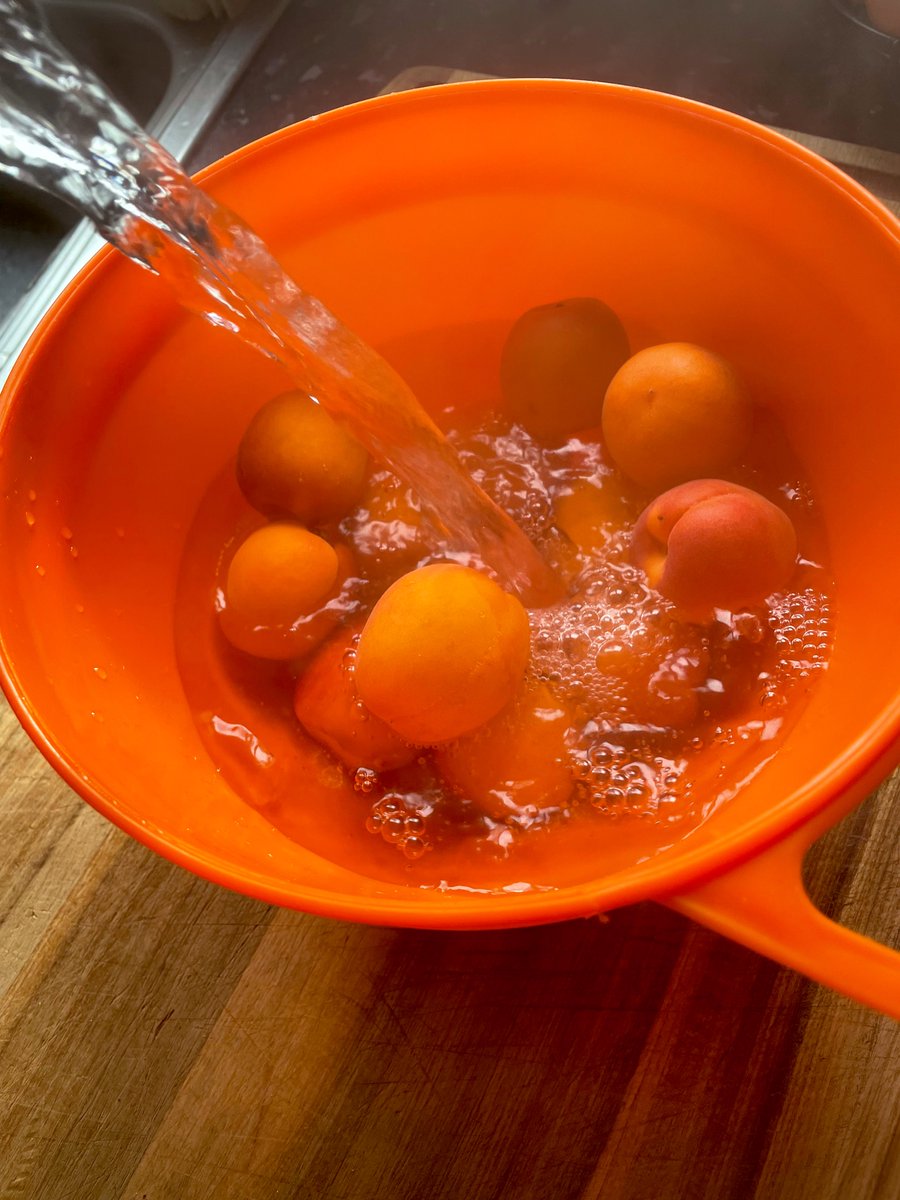 I’m making two jams today. First up: apricot jam. Let’s revisit apricot jam because the usual storebought one always tastes shit. Let’s make it a good one. First, I’m blanching them in hot water for 30 seconds, then draining. This will soften the skins so they’re easier to peel.