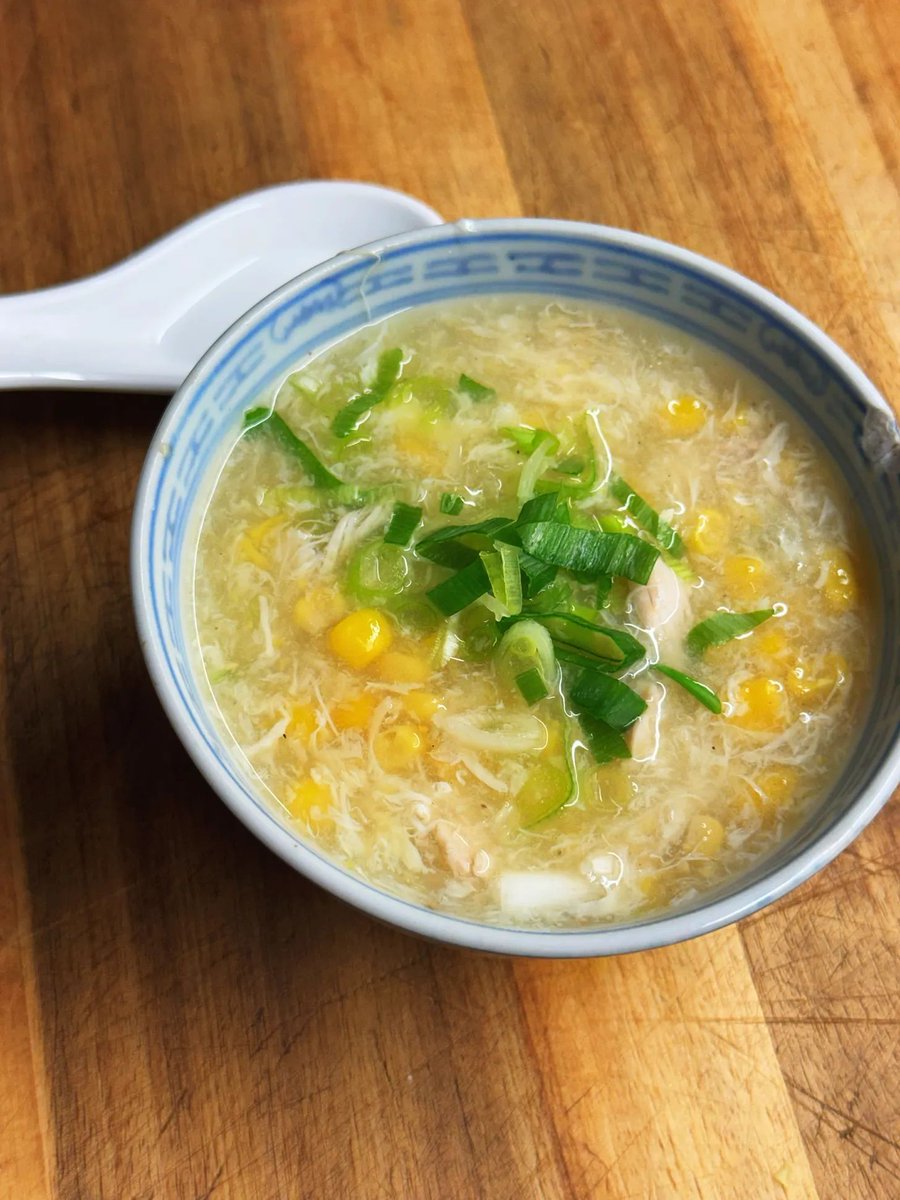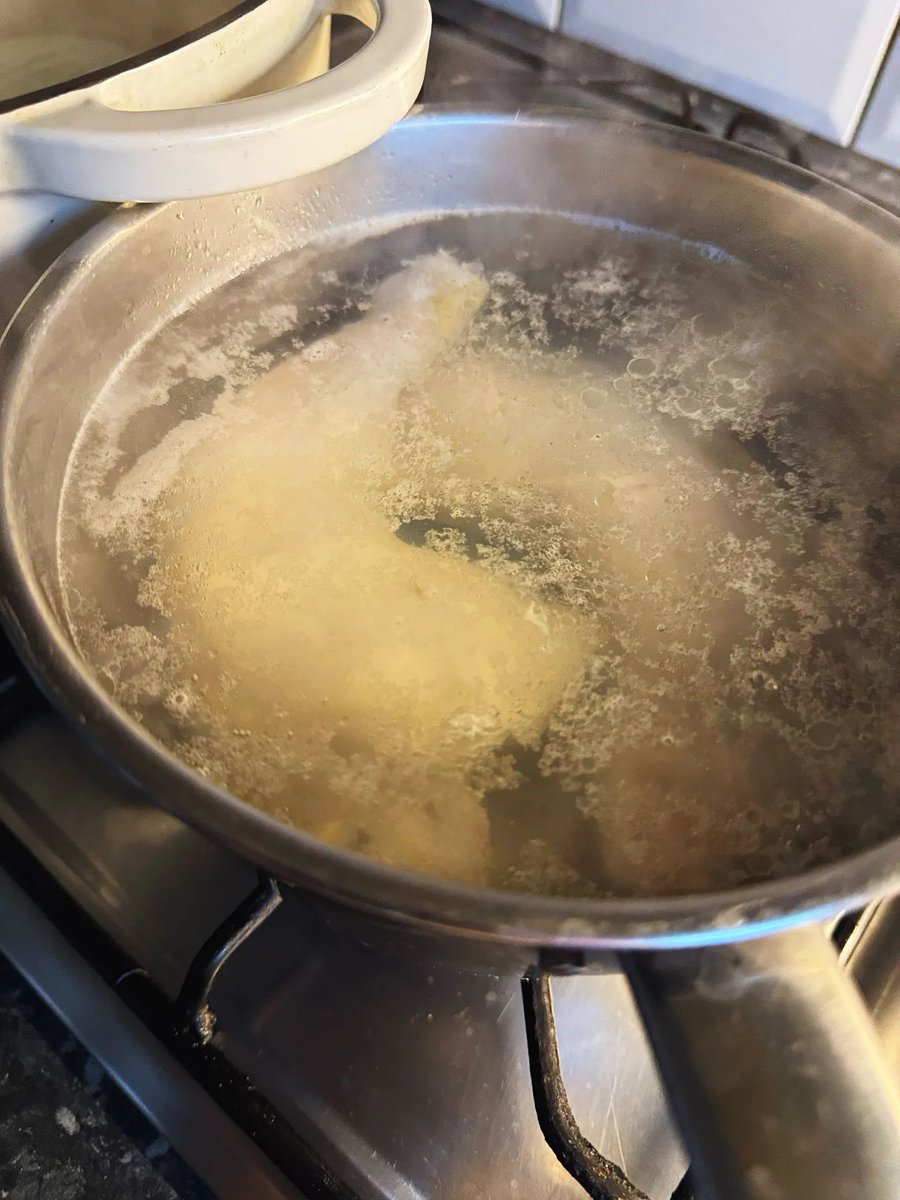 Most Chinese takeaway restaurants will use a cheap chicken stock powder thickened with cornflour, and a poached, shredded chicken breast. Nothing wrong with that, but this is the proper way: a light, nutritious stock made with chicken legs. Add 2x chicken legs, with the skin removed. I highly recommend first giving them a 5 minute boil in a separate pan of boiling water. This is an old-fashioned trick that I've seen in lots of cultures. You may think it's faff, but this initial 'blanch' removes most of the chicken's soft fat, along with any flimsy protein or 'impurities'. It also means you won't have to skim the stock *once*, and helps to keep it clear. It's worth it. Once blanched, transfer them to the main pot with 1.5L of simmering water.