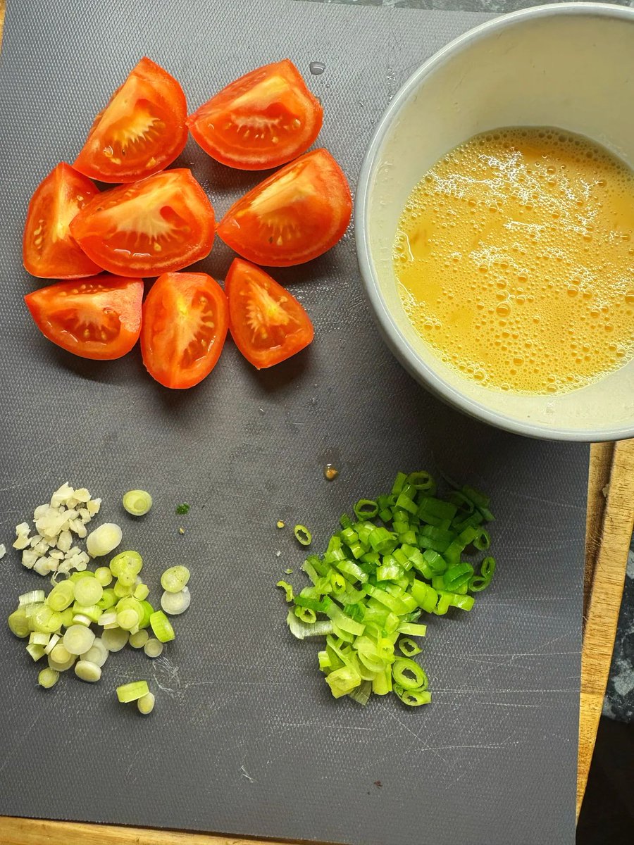 You need one tomato for every egg. I have two eggs and two tomatoes. The eggs are beaten with a pinch of salt, and often the Chinese will add a teaspoon or two of Shaoxing wine for aroma. Set these aside.