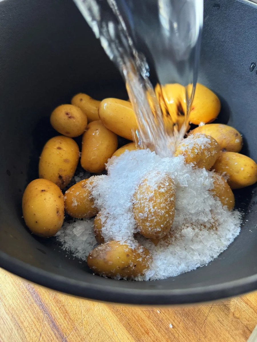 First, scrub the baby potatoes - about 500g of them - and place them into your pot. Now we're going to add...60g of flaky sea salt. That's an enormous amount of salt. When people say pasta water should be salty as the sea, they can never be serious. Rest-assured the potatoes won't absorb all of this salt - most will be drained away - but this amount of salt will quickly draw liquid from the potato to produce a buttery, intensely flavourful, truffle-like result. Add 350ml of water - it won't seem like a lot, but it'll be enough to steam any potatoes that poke out. Place it onto boil.