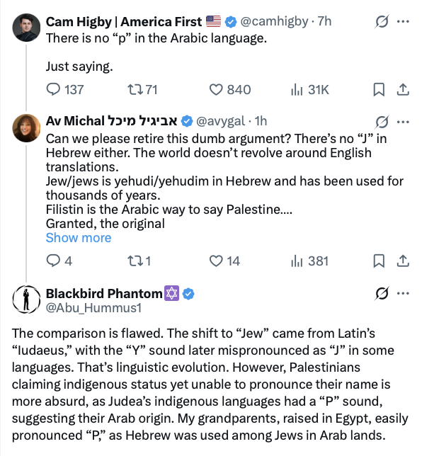 I can't get bored with the "Palestinians R Fake Because Arabic No P" thing is that these κοπρηγκεφαλοπαθές keep finding new ways to make it funny again. Bro is so hilariously close & yet so far