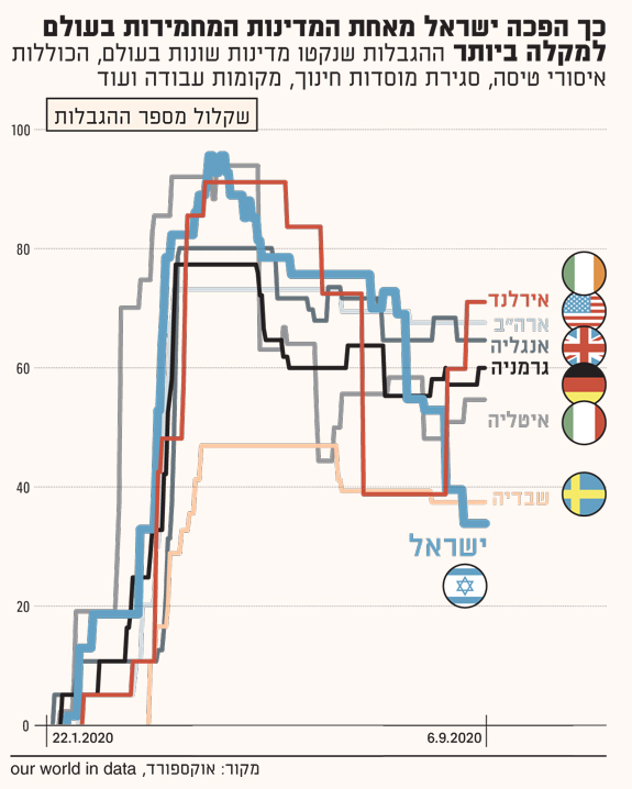 זה הגרף שנשאב מהאתר Our World in Date של אוניברסיטת אוקספורד. ה"ציון" שניתן למדינות הוא שיקלול של שלל הגבלות - מסגירת מוסדות לימוד ועד בידוד ביתי לחוזרים ממדינות בסיכון. מעניין לשים לב: מדובר בשיקלול של מה המדיניות המוצהרת, לא של מה שקורה בשטח באמת.