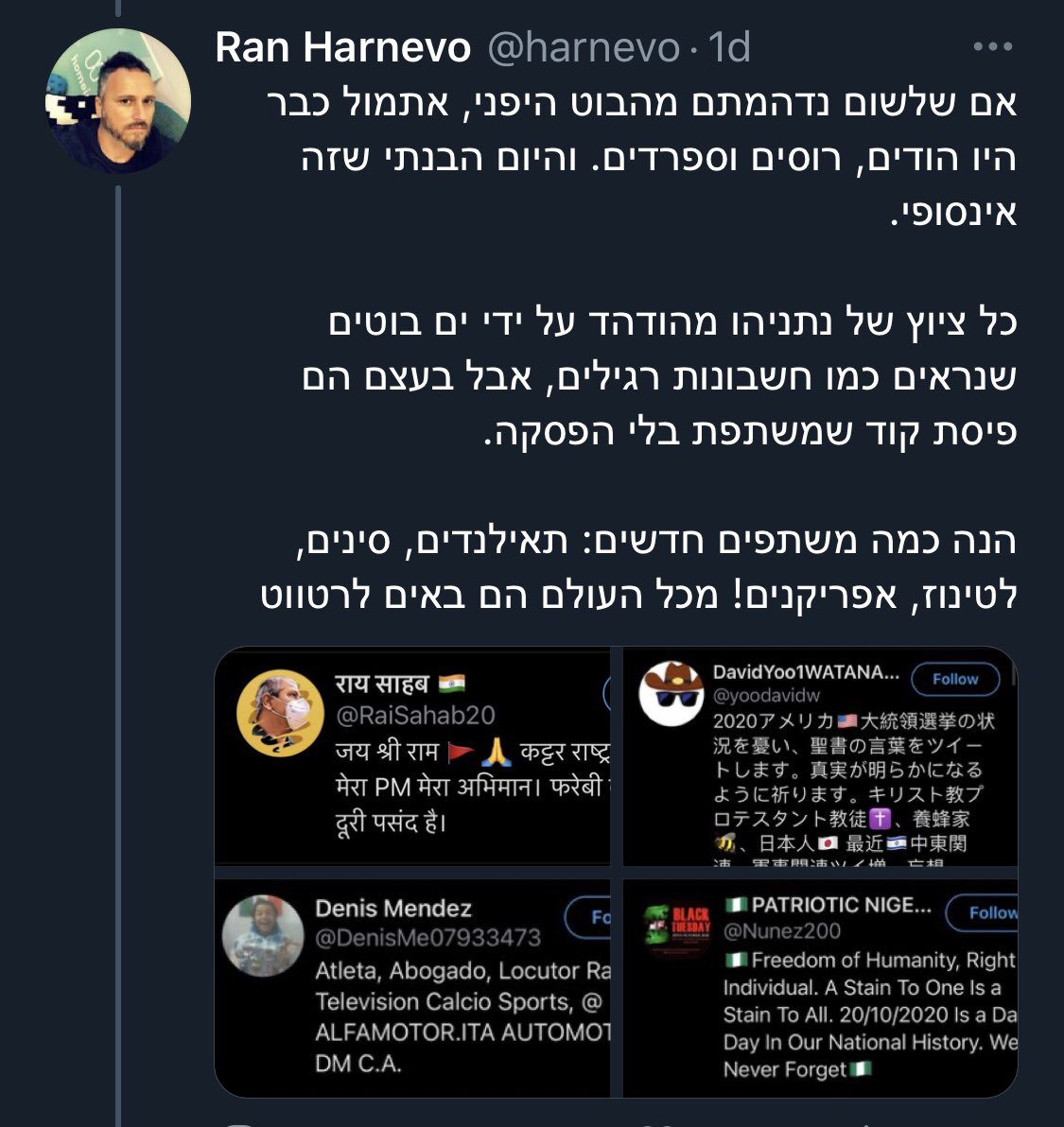 רן מביא כאן ארבעה דוגמאות. הנה הראשון. בוט? על סמך מה? מדובר בלאומן הודי קלאסי שלא אוהב מוסלמים, חולה על מודי ובהתאם חולה גם על התחת של ביבי. דפדוף מהיר בטיימליין שלו מגלה מלא אינטראקציות אותנטיות לחלוטין. הנה אחת מיני רבות.
