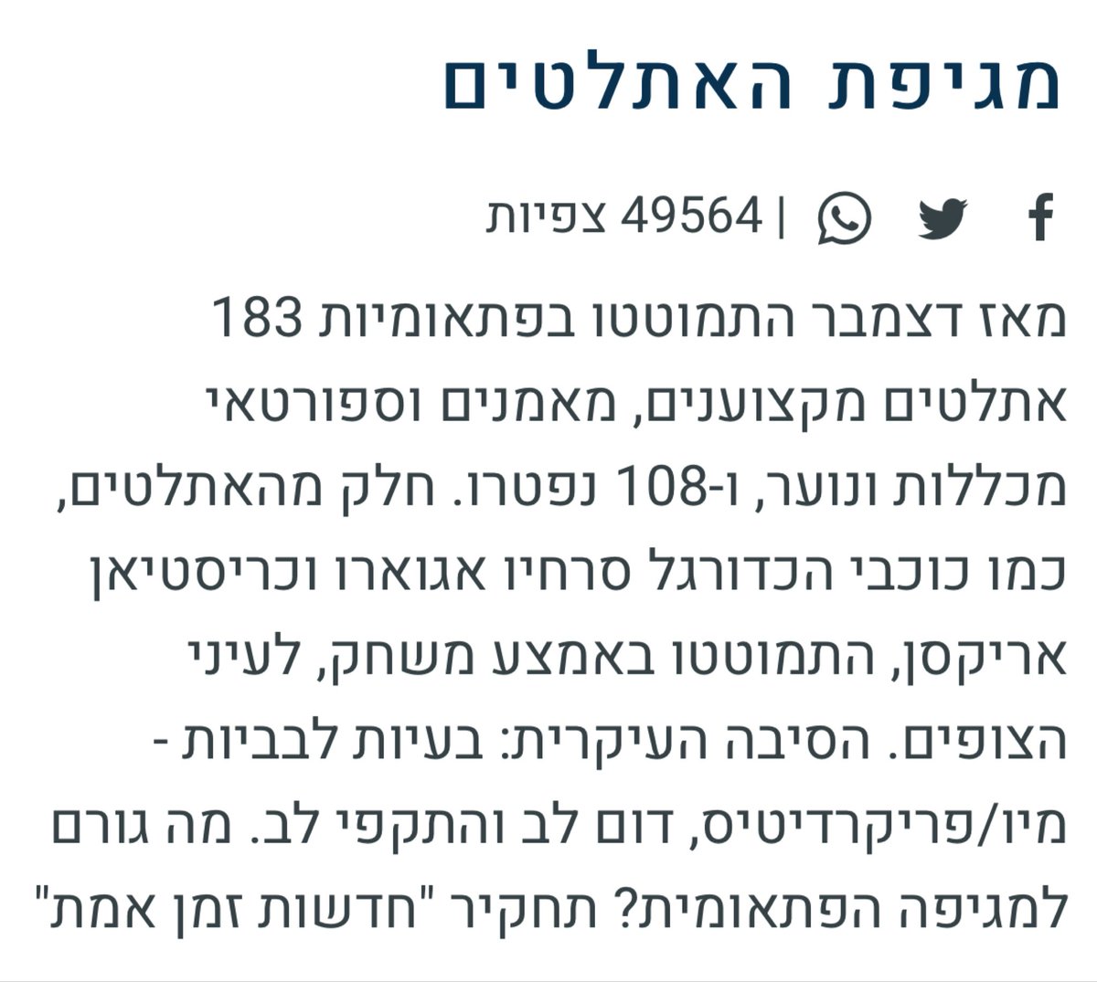 מלבד העובדה ששיר-רז וחבריה ה״תחקירנים״ הכניסו לסטטיסטיקה שלהם ספורטאים שהתאבדו ושמתו בתאונות על המגרש וממחלות כרוניות, כפי שכבר חשפתי כאן בשרשור המצורף, נשאלת שאלה חשובה: האם 108 ספורטאים שמתו באופן פתאומי בשנה אחת זה באמת דבר כל כך חריג? על מה בעצם הם מבססים את הטענה הזאת? > https://twitter.com/aradboaz/status/1461299728789000193