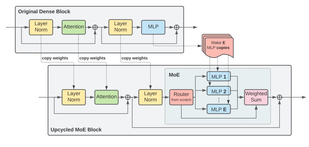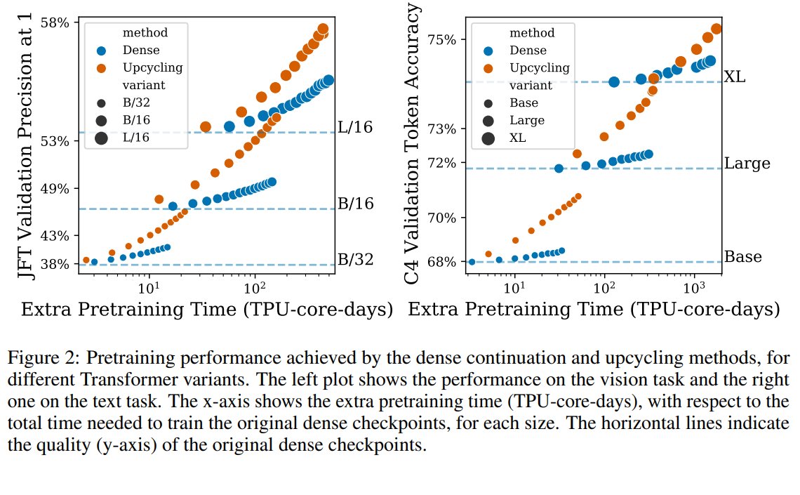 As this figure shows, Sparse Upcycling outperforms the dense continuation on ViT and T5 in terms of extra pretraining time. (2/N)