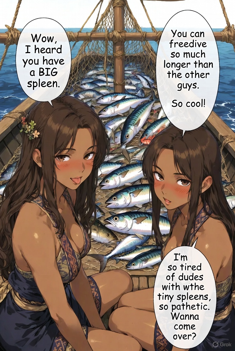 POV: It is 1100 A.D. on an Indonesian island. You are a Bajau sea nomad who freedives for seafood. Your spleen is 15% larger than other locals due to a mutation in PDE10A gene. You can store more haemoglobin rich blood, letting you breathhold & dive longer. Local girls notice how much better you are at diving and hunting fish. You are about to experience natural selection cell.com/cell/fulltext/…