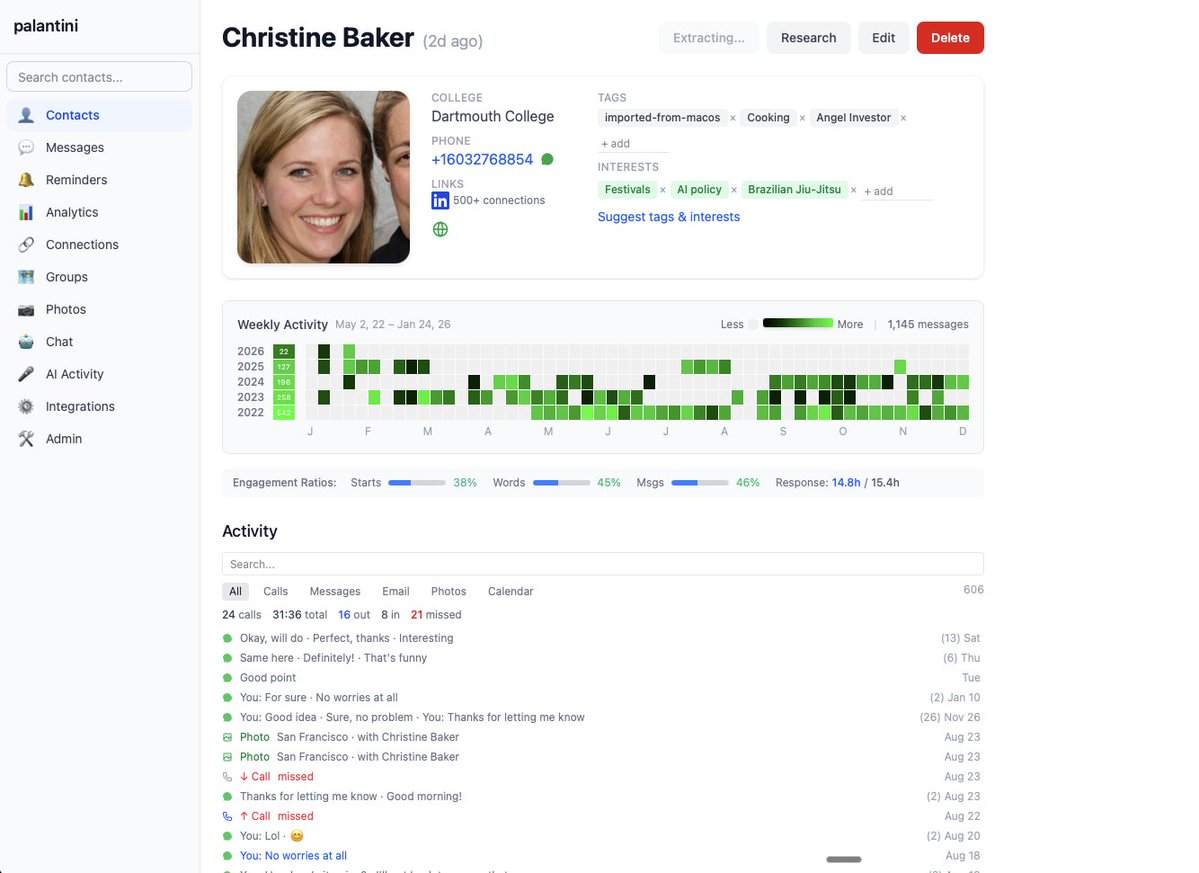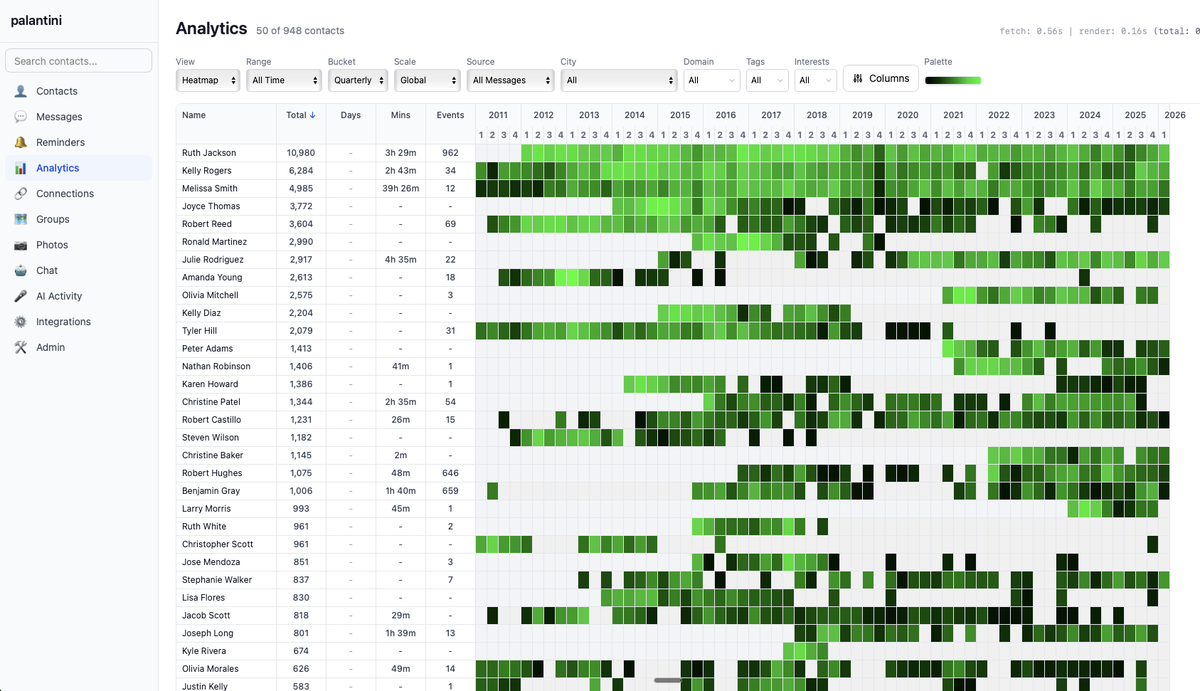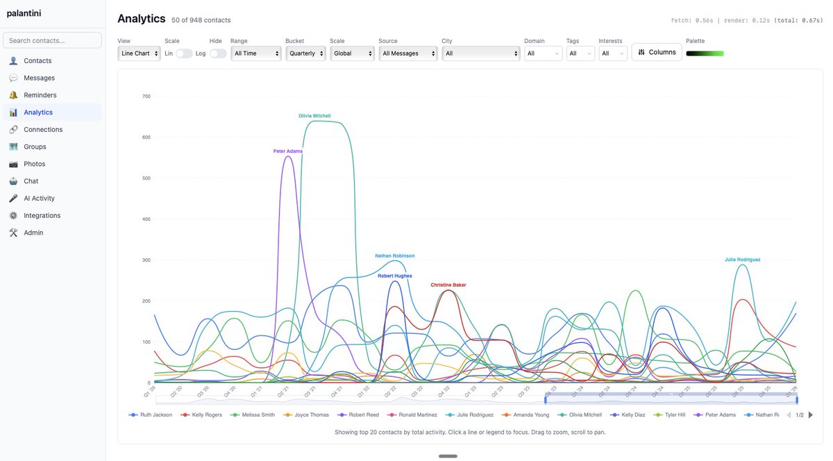 I can do arbitrary analytics, like these graphs of all my relationships as they rise and fall over time: