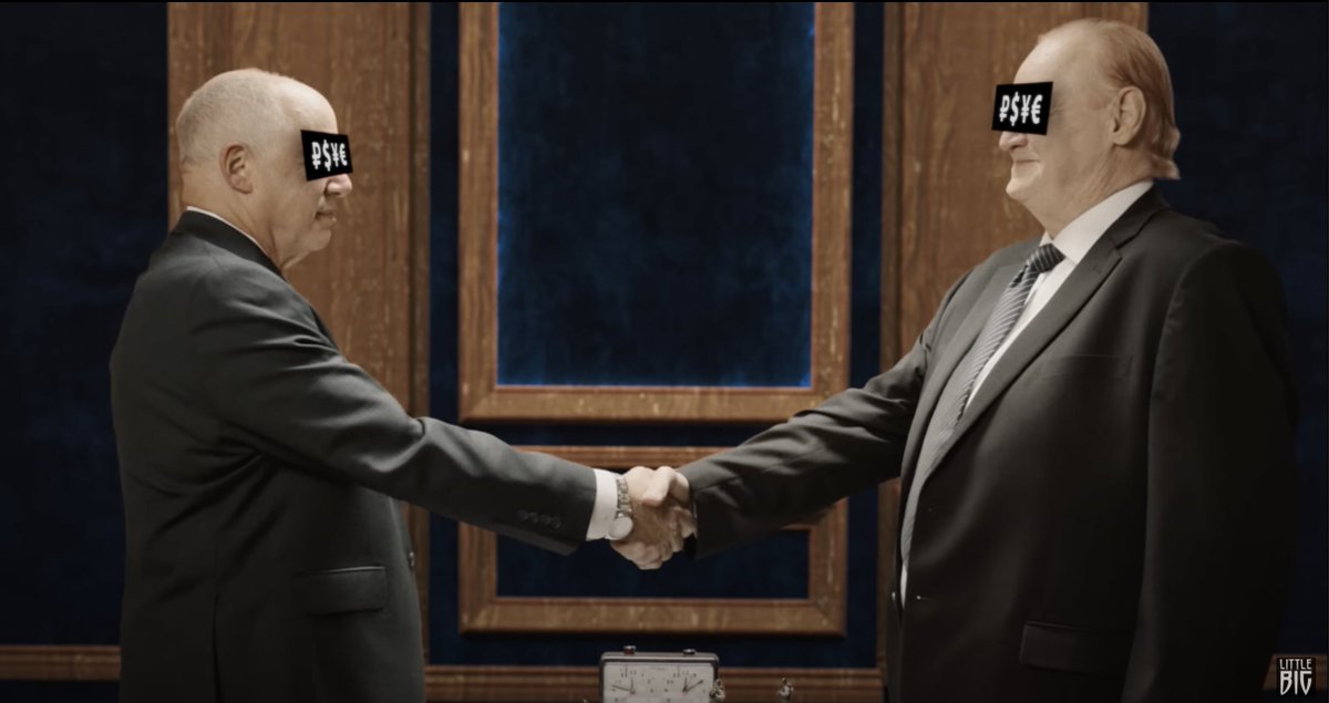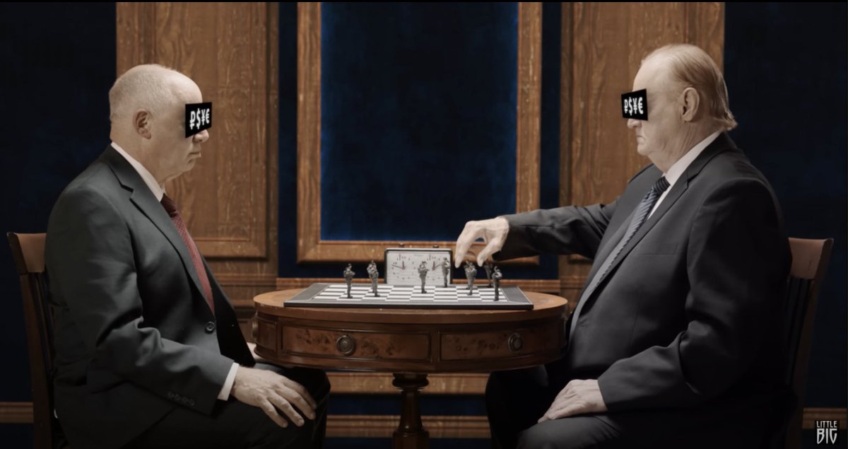 в начале клипа мы видим очень глубокий очень философский очень свежий образ, что война – всего лишь игра богатых дядечек, солдаты, да и другие люди, просто пешки в их игре. потом дядечки жмут друг другу руки, потом один целиться из пистолета-руки в другого