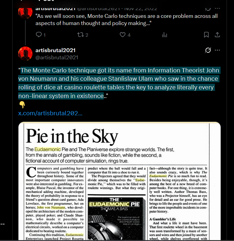 The Monte Carlo technique got its name from Information Theorist John von Neumann and his colleague Stanlislaw Ulam who saw in the chance rolling of dice at casino roulette tables the key to analyze literally every non-linear system in existence"..https://x.com/artisbrutal2021/status/1594978485663109120