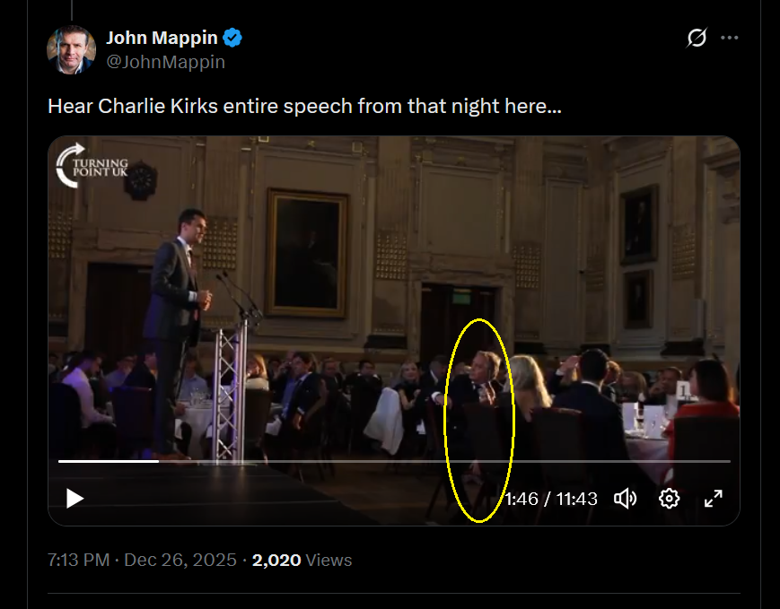 https://twitter.com/artisbrutal2021/status/2004650870009663531The Duke of Marlborough was sitting next to Amanda Eliasch at that TPUK event where Charlie Kirk made his speech.