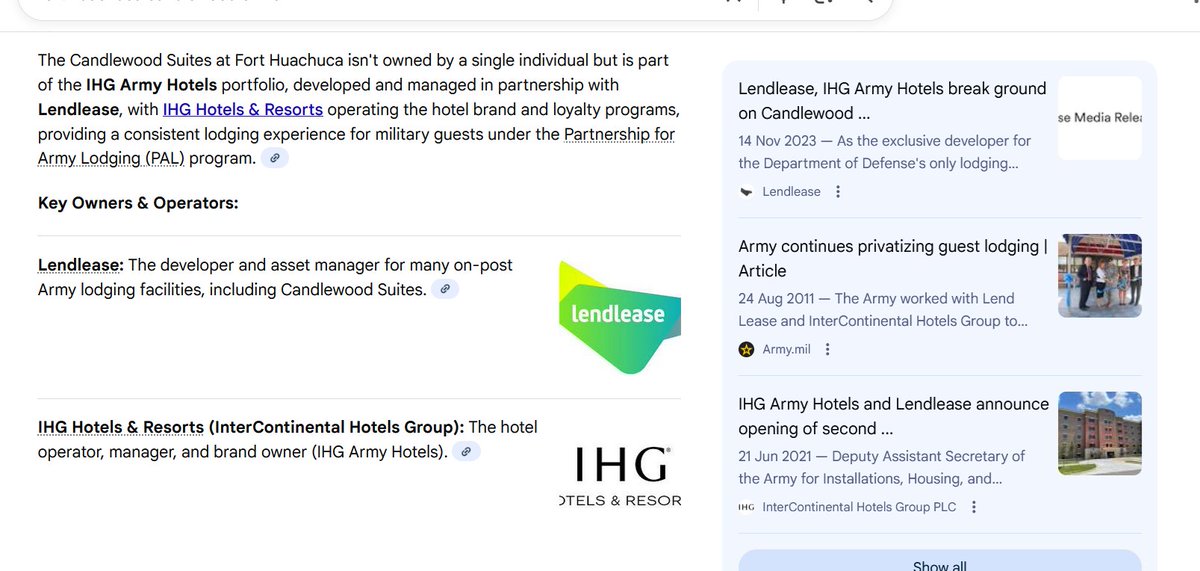 They keep mentioning the Candlewood Suites at Fort Huachuca - part of the IHG Army Hotels portfolio, developed and managed in partnership with Lendlease, with IHG Hotels & Resorts operating the hotel brand and loyalty programs..https://x.com/artisbrutal2021/status/1677964307294830592