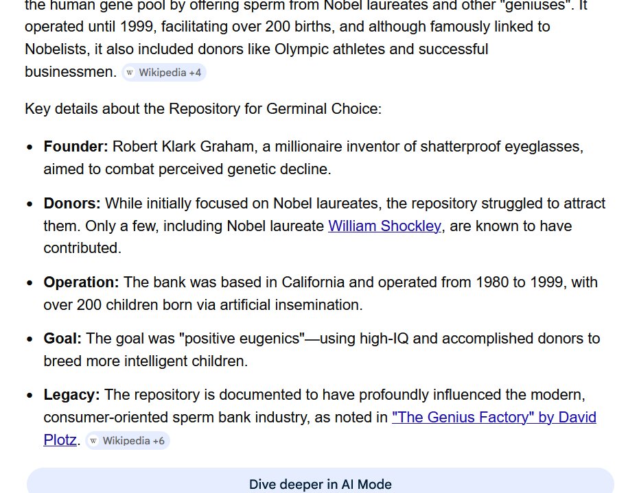 "The Repository for Germinal Choice, founded by Robert Klark Graham in 1980 in Escondido, California, was a controversial "Nobel Prize sperm bank" aiming to improve the human gene pool by offering sperm from Nobel laureates and other "geniuses"."..https://x.com/artisbrutal2021/status/2025846367747207358