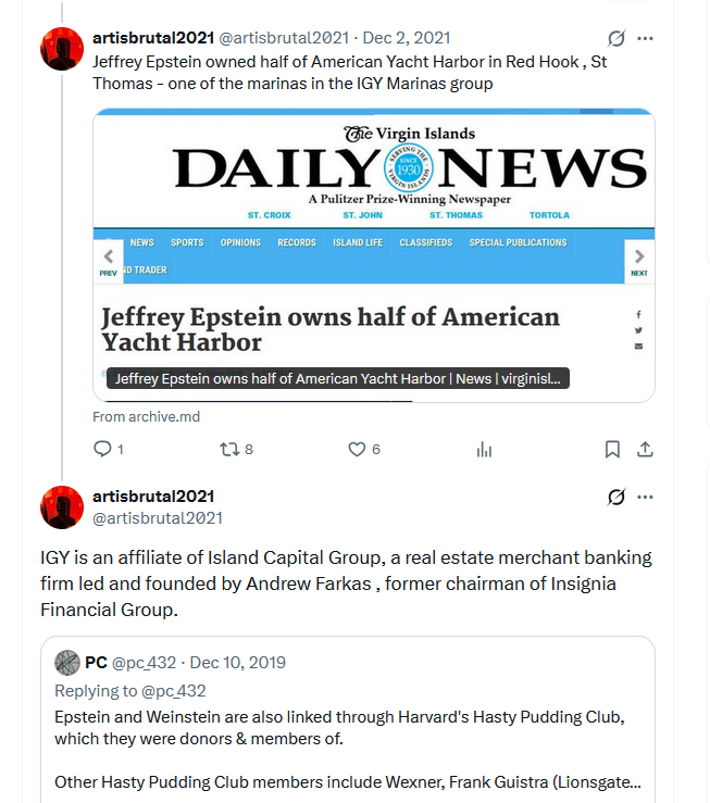 Jeffrey Epstein owned half of American Yacht Harbor in Red Hook , St Thomas - one of the marinas in the IGY Marinas group.https://x.com/artisbrutal2021/status/1466354656079233028