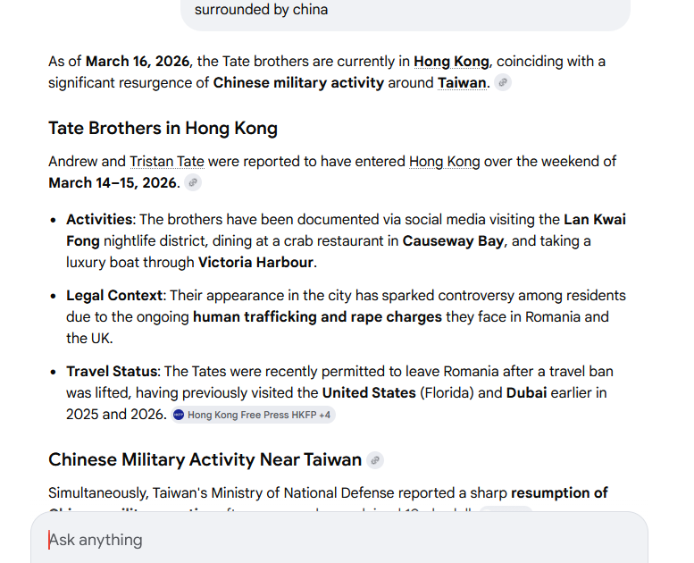 " As of March 16, 2026, the Tate brothers are currently in Hong Kong , coinciding with a significant resurgence of Chinese military activity around Taiwan.🤔