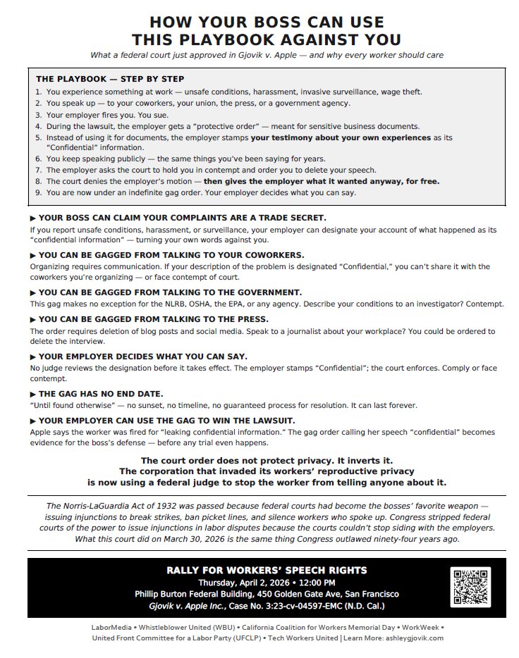 https://twitter.com/ashleygjovik/status/2032924576662041019Apple's motion was denied — the judge said Apple didn't follow the rules. Then the judge gave Apple everything Apple asked for anyways & more, without explanation or justification. Takedown order. Gag order. Sealing. Despite no motion for any of it.