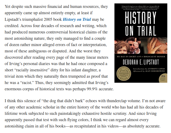 Every single thing Irving ever wrote, including his personal diaries was subjected to years of hostile scrutiny and analysis by a team of high powered lawyers. After all of this only a small list of minor errors was produced. What other scholar has ever had this treatment?