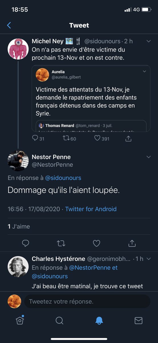 Pour mémoire, vite fait : un de mes tweets a été RT par un gros compte (14k). Le tweet en lui-même ne me pose pas de pb. Mais pas les commentaires en-dessous. Pas du tout.