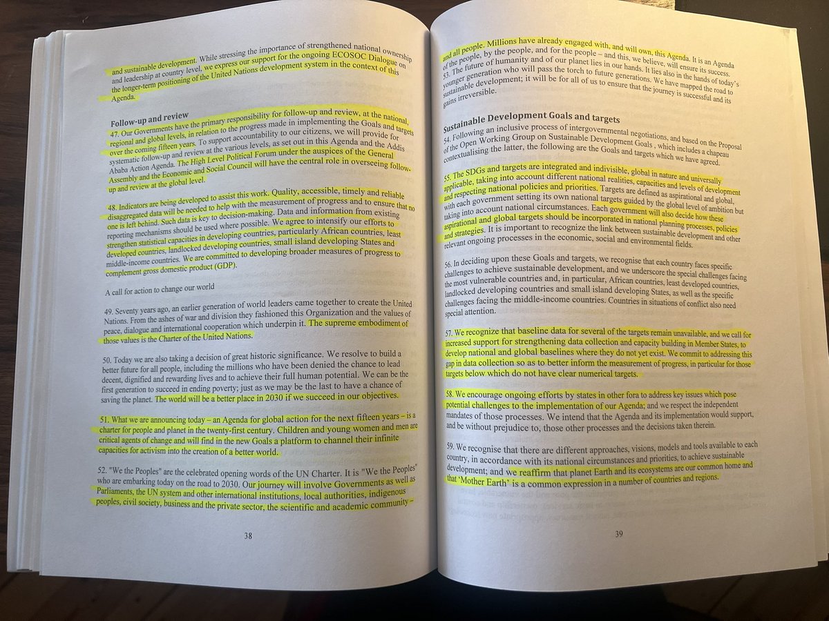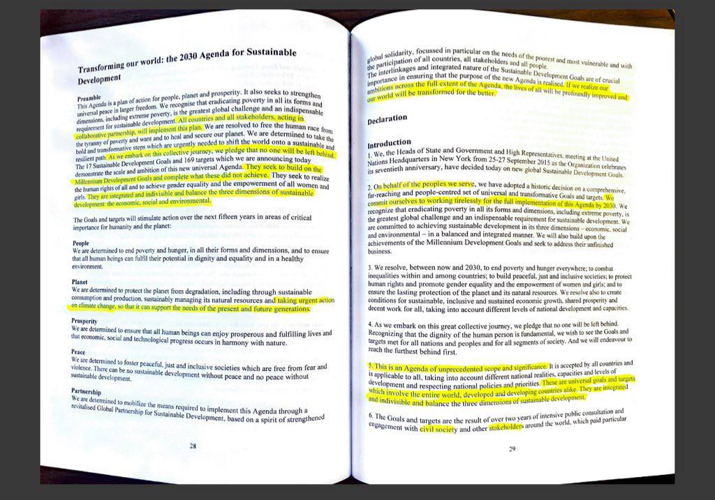 Wer sich schnell ein Bild über das antidemokratische Pamphlet machen möchte: Hier UN „Agenda 2030“ mit meinen Hervorhebungen. Ja, es ist anstrengend zu lesen, aber wer das nicht tut, kann beim Thema UN schlichtweg nicht mitreden. Ich schätze, 99% meiner Kollegen haben das Ding nie gelesen.