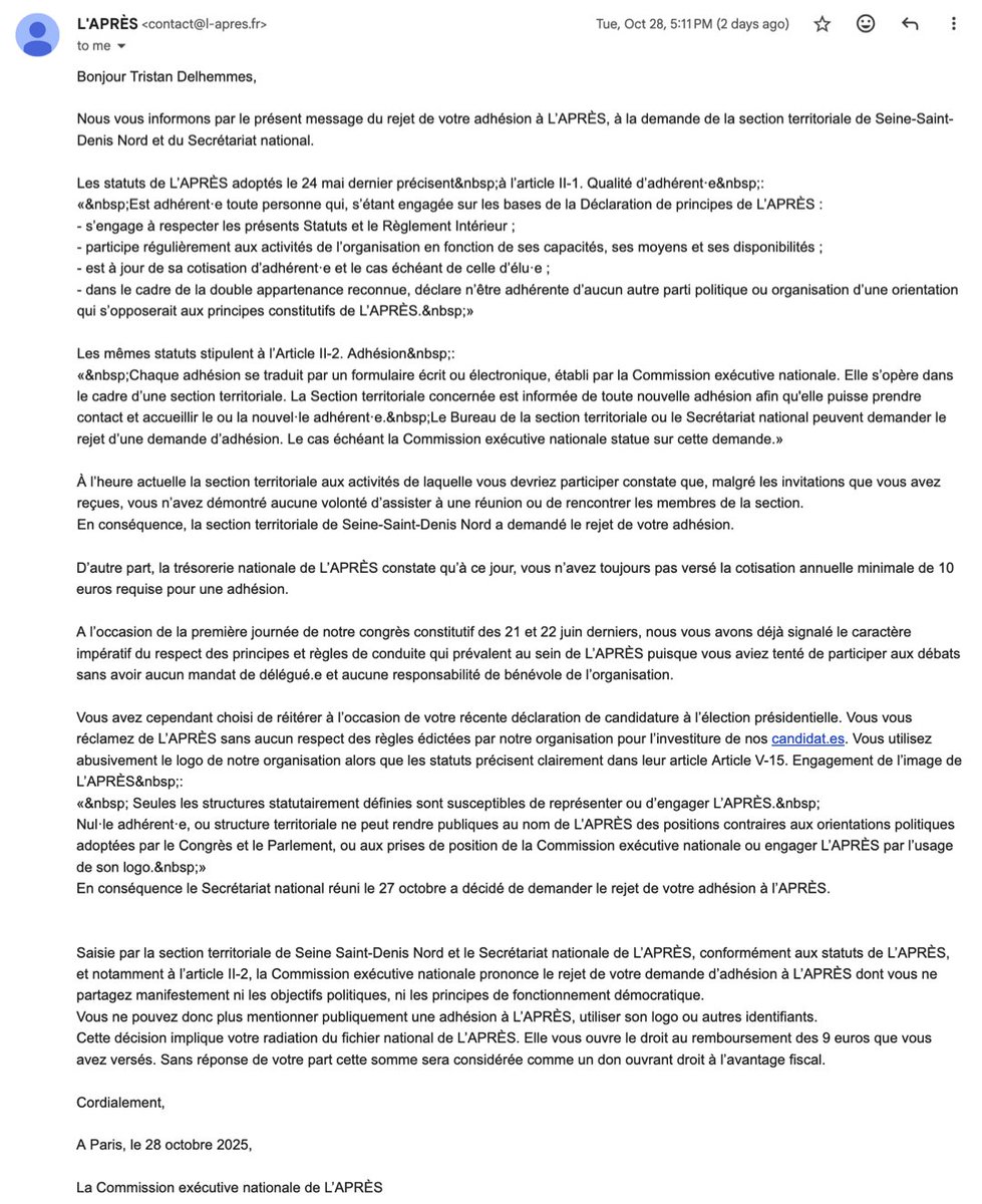 Voici le mail d’exclusion que l'APRÈS m'envoie.