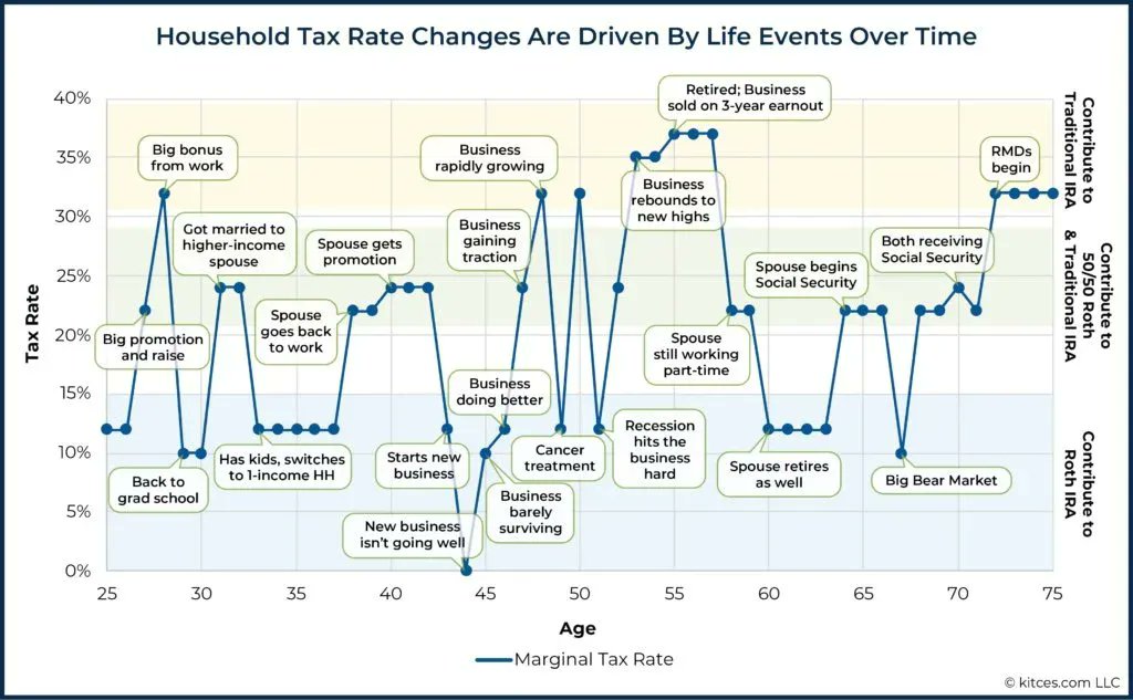 Timeline: 1. Grow up 2. Go off to college 3. Work your first job 4. Go to biz school 5. Back to work 6. Start a family 7. Start making good money 8. Make great money 9. Retire 10. Turn 72