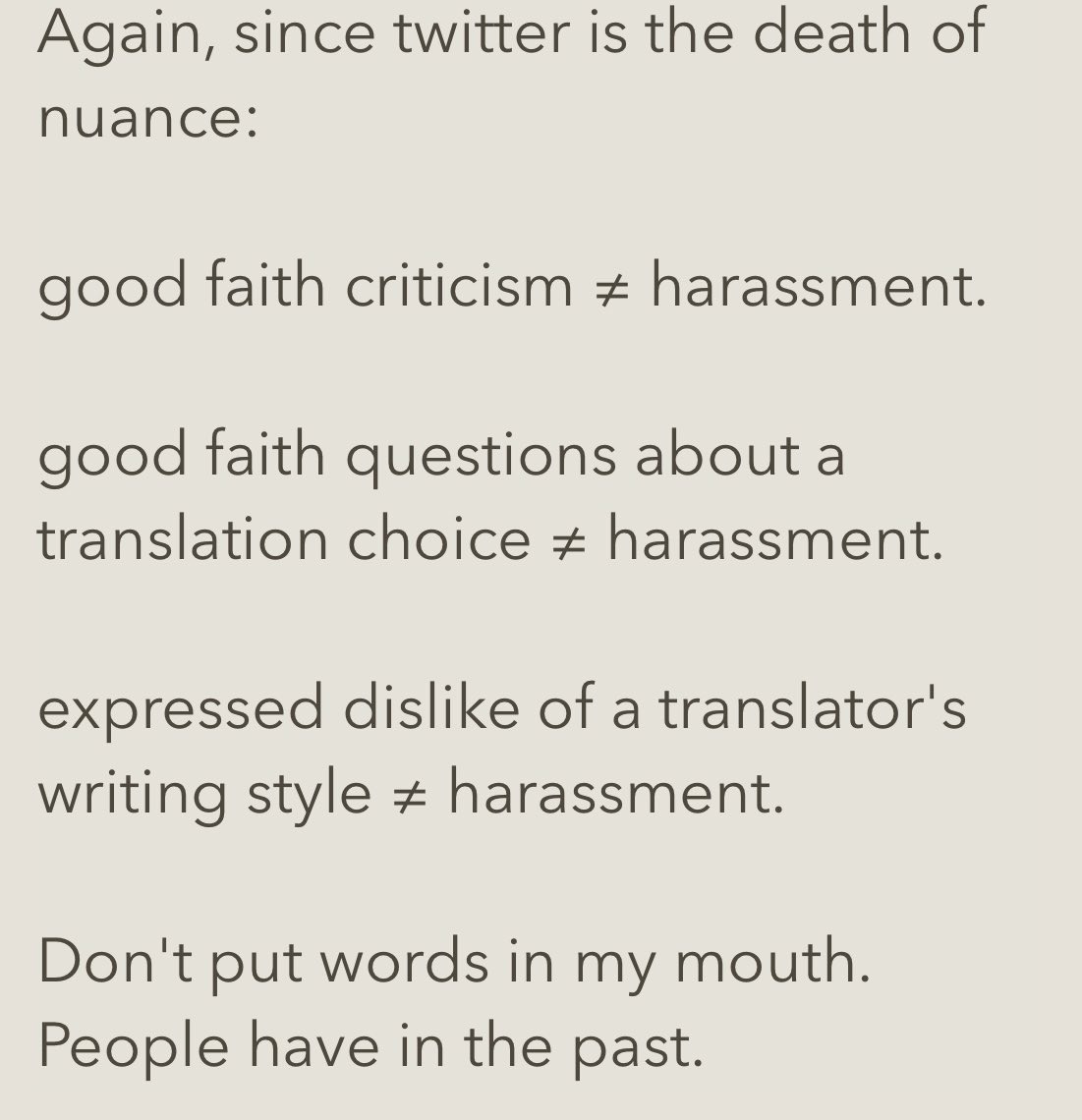 In my experience working within J>E TL industry, you’re going to get blocked or muted regardless. The current trend within the clique is to play victim when faced with negative feedback. And to weaponise that in their favour.