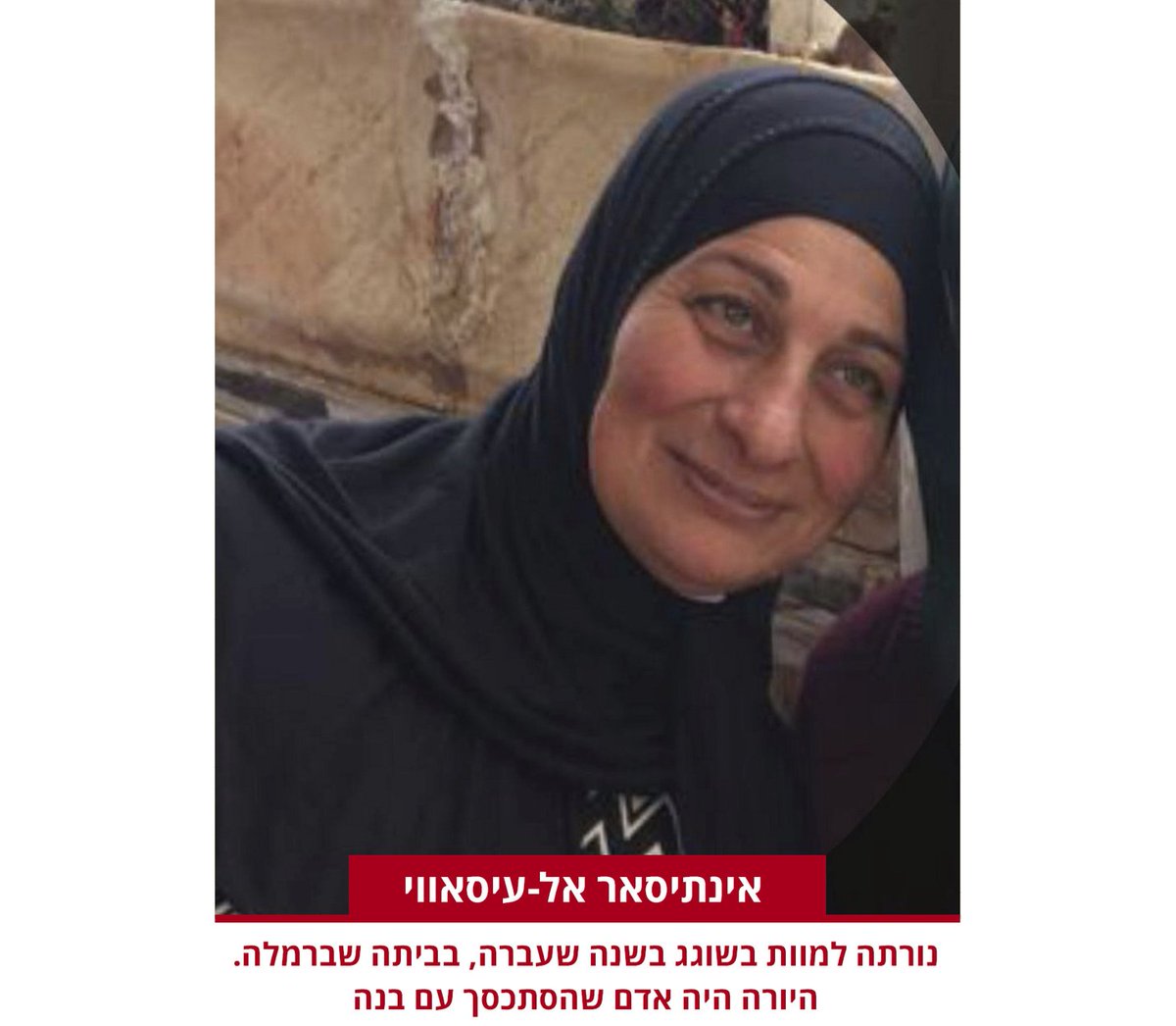 2/4 אל-עיסאווי, אם לחמישה מרמלה, נהרגה במאי בשנה שעברה כשעבריין שביקש להפחיד את בנה ירה 13 כדורים לעבר ביתה. היא היתה בחצר ונפגעה, עוד אדם נפצע מהירי. היורה, נמלט ונתפס לאחר שבצעד חריג, המשטרה גרמה לאחיו להפלילו. הרצח נחשב לאחד מתיקי הדגל של המשטרה במאבקם בפשיעה בחברה הערבית >>