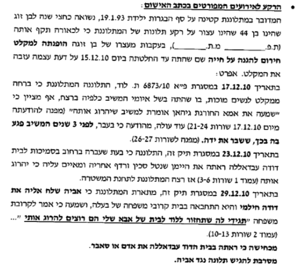 יום אחד פגש אותה בשכונת הרכבת בלוד ורדף אחריה ברחוב עם סכין כשהוא צועק לה "תעצרי יא זונה". באותו יום במקרה קוסמי הוגש נגדו כתב אישום על כך שאיים שישסף את גרונה של אחות אחרת. אגב, לא רק אחיה חיפש אחריה אלא גם דודה בשליחות אביה, כך לפי ראיות שהוגשו לביהמש. היא סירבה להתלונן נגדם >>