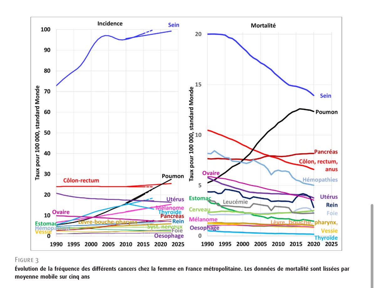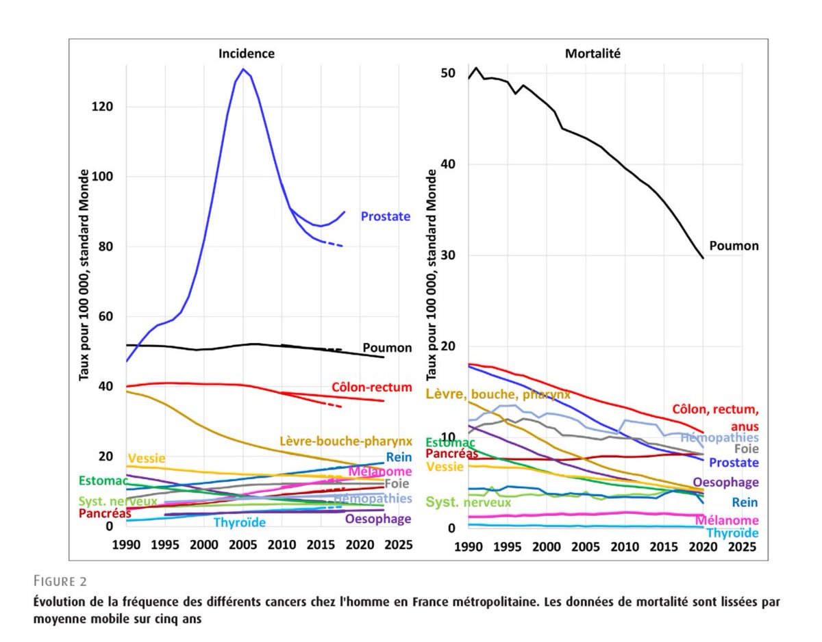 Données France : courbe en rouge (homme à gauche, femme à droite) C Hill bulletin du cancer 2024