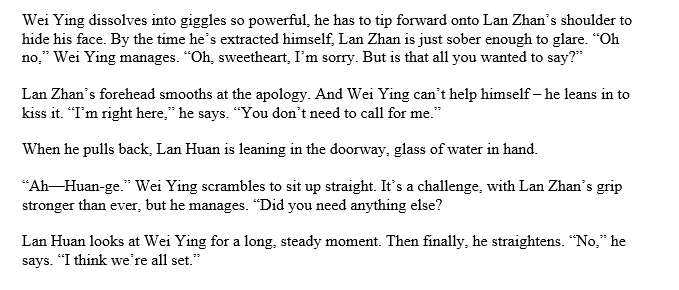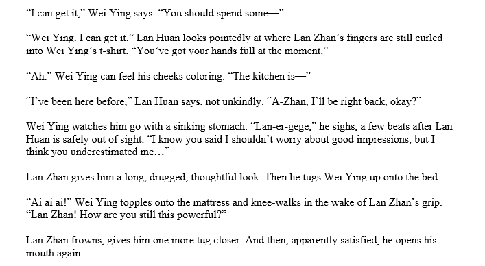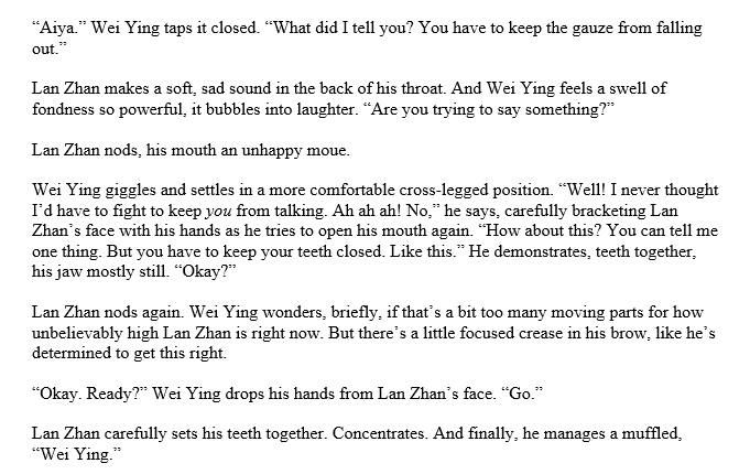 https://twitter.com/bee_off_main/status/1288258391899545603Lan Wangji shifts Wei Wuxian up and across, until Wei Wuxian rests fully across his front. The plane of his chest is smooth against Wei Wuxian's cheek. "Better?" he asks.