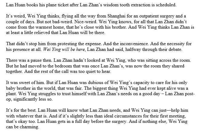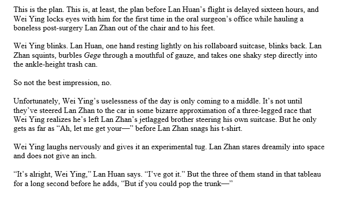 https://twitter.com/bee_off_main/status/1369778617903890435Wei Ying wins the fight to pay for their Didi – if by winning you mean he orders it when Lan Zhan isn’t looking – and he drifts on the ride home. It hurts to focus, which actually helps. It makes it easier not to stare at LZ's profile in the soft kaleidoscope of the city lights.