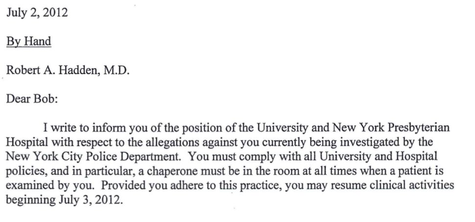 @Columbia 2/ In this letter – cc’d to the head of his department, the dean of the med school & the president of @nyphospital – Hadden is advised he may return to work so long as a chaperone is in the room with him when seeing patients.