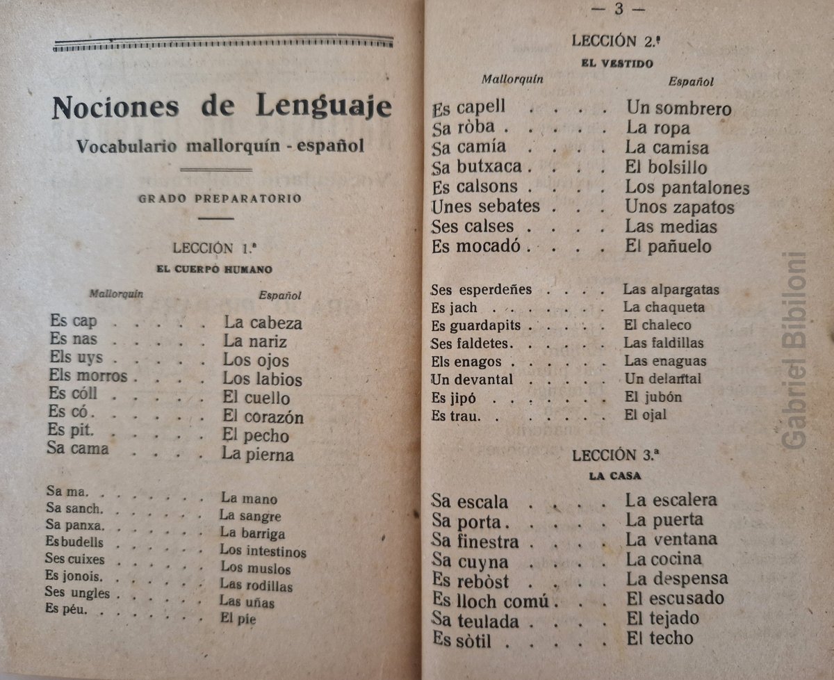 A la postguerra l'espanyol encara era ben desconegut en el gros de la població. Per a canviar-ho els llibres escolars duien al final vocabularis com aquest. Llibre de la meva infantesa, "Grado preparatorio" de Miguel Porcel, 1957. Ortografia intencionadament desbaratada.