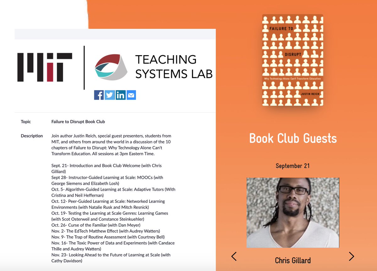 Discussing the introduction and framing the conversation, we have @hypervisible and @audreywatters. Then Part I of the book addresses three "genres" of learning at scale... (Sign up at failuretodisrupt.com/virtualbookclub) #failuretodisrupt
